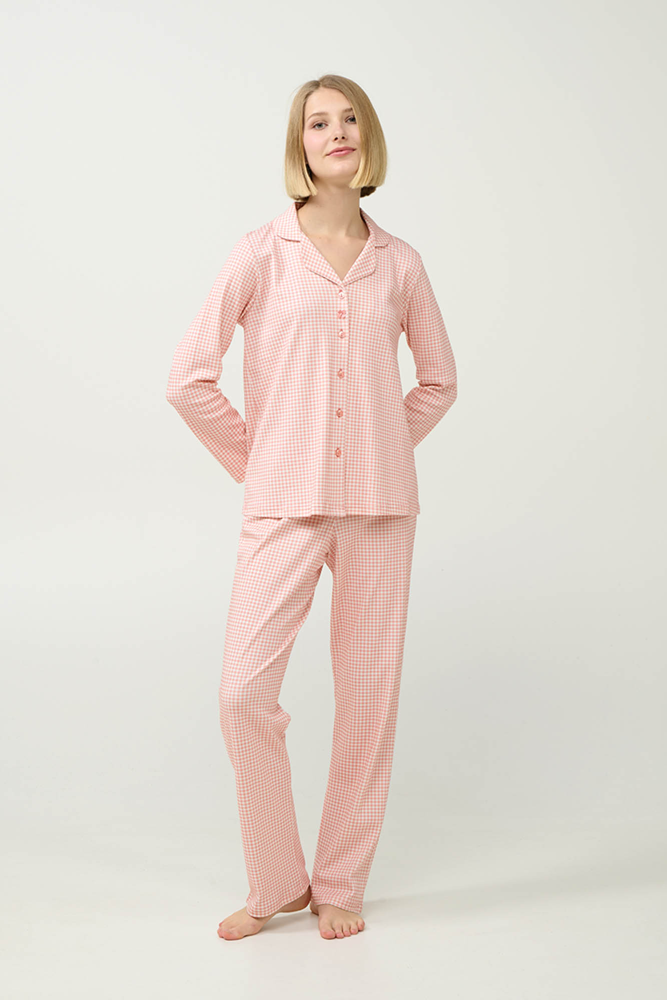 Προσθέστε μια νότα γοητείας στα βράδια του χειμώνα με αυτό το σετ γυναικείες πυτζάμες σε ροζ καρό μοτίβο, κατασκευασμένο από 100% βαμβάκι interlock. Σχεδιασμένο με κλασικό κουμπωτό πάνω μέρος και μακριά μανίκια, που προσφέρει άνεση και διαχρονικό στυλ στην εμφάνιση σας. Απαλό, διαπνέον και φιλικό προς το δέρμα, το ύφασμα εξασφαλίζει άνεση όλη τη νύχτα, είτε χαλαρώνετε στο σπίτι είτε ετοιμάζεστε για ύπνο.