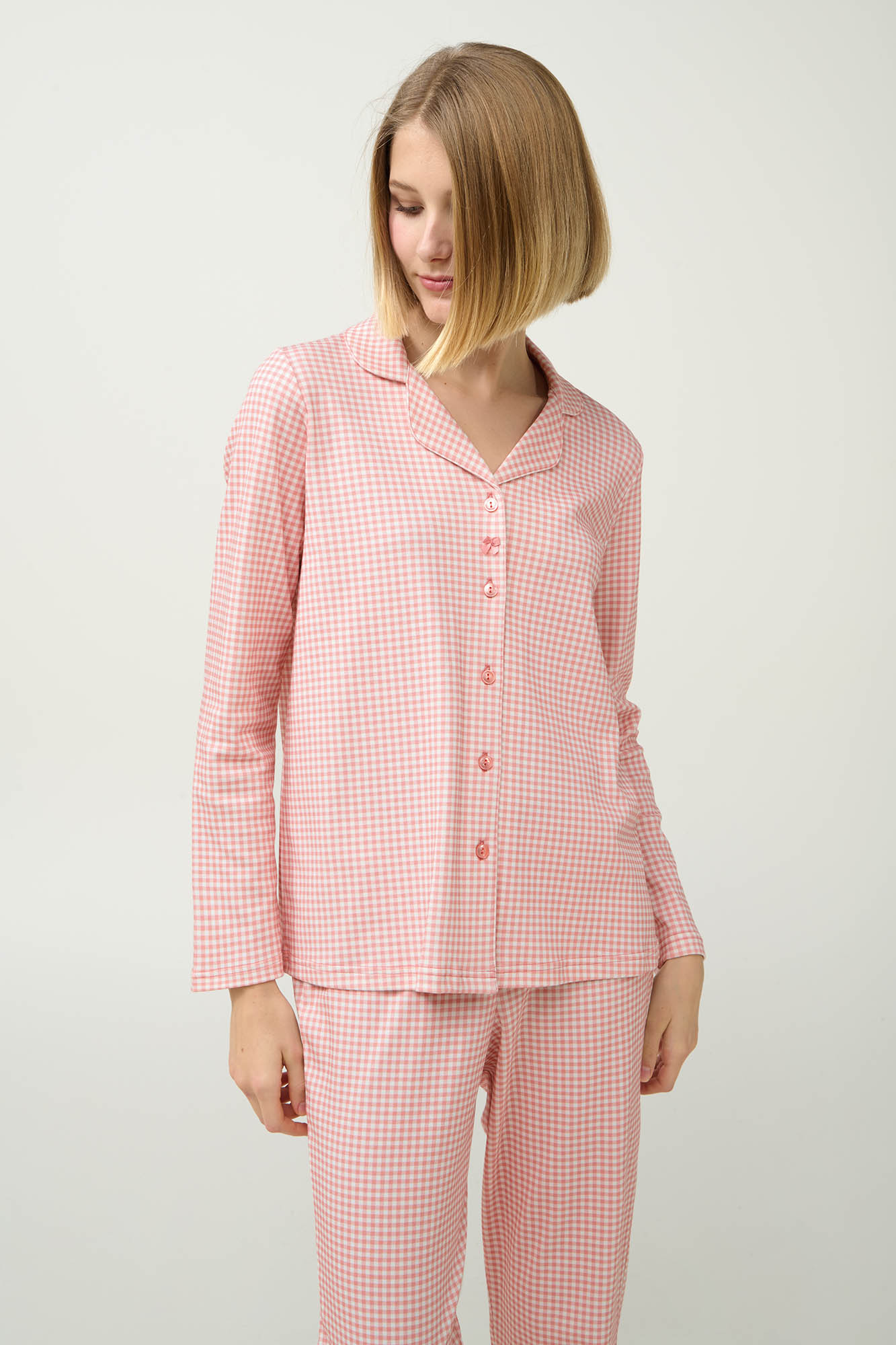 Προσθέστε μια νότα γοητείας στα βράδια του χειμώνα με αυτό το σετ γυναικείες πυτζάμες σε ροζ καρό μοτίβο, κατασκευασμένο από 100% βαμβάκι interlock. Σχεδιασμένο με κλασικό κουμπωτό πάνω μέρος και μακριά μανίκια, που προσφέρει άνεση και διαχρονικό στυλ στην εμφάνιση σας. Απαλό, διαπνέον και φιλικό προς το δέρμα, το ύφασμα εξασφαλίζει άνεση όλη τη νύχτα, είτε χαλαρώνετε στο σπίτι είτε ετοιμάζεστε για ύπνο.