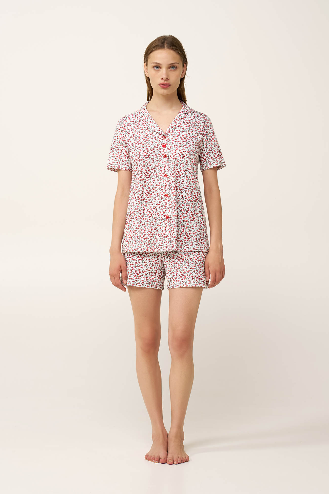 Δώστε μια νότα φρεσκάδας στα ζεστά βράδια φορώντας ένα σετ καλοκαιρινές γυναικείες πυτζάμες, με ζουμερές κόκκινες φράουλες σε λευκό καμβά. Κατασκευασμένο από απαλό και διαπνέον 100% βαμβάκι single jersey, αποτελείται από κλασικό τοπ με κουμπιά και ασορτί κοντό παντελόνι, δημιουργώντας μια χαλαρή, καλοκαιρινή εμφάνιση. Φρέσκο και διαχρονικό, θα το απολαύσετε κάθε στιγμή της ημέρας στο σπίτι ή τις διακοπές.