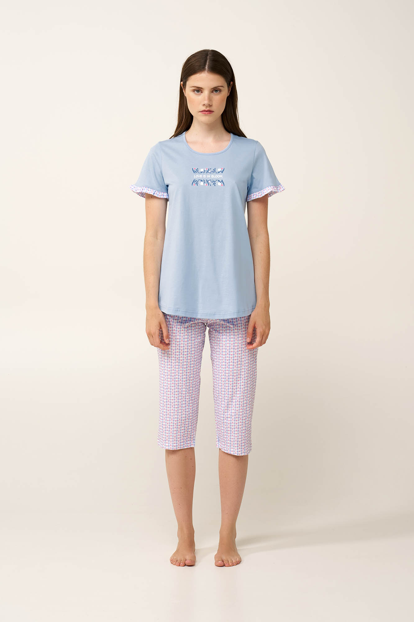 Απολαύστε την άνεση που σας προσφέρει ένα σετ γυναικείες πυτζάμες, κατασκευασμένο από 100% απαλό και διαπνέον βαμβάκι single jersey. Το κοντομάνικο τοπ διαθέτει διακριτικό τύπωμα στο στήθος, ενώ τα μανίκια τελειώνουν με ένα χαρούμενο καρό μοτίβο με τουλίπες σε ροζ και μπλε αποχρώσεις, που επαναλαμβάνεται και στο κάπρι παντελόνι. Ελαφρύ και άνετο, το σετ προσφέρει ελευθερία κινήσεων τις πιο ζεστές ημέρες, είτε χαλαρώνετε στο σπίτι είτε απολαμβάνετε έναν ξεκούραστο ύπνο.