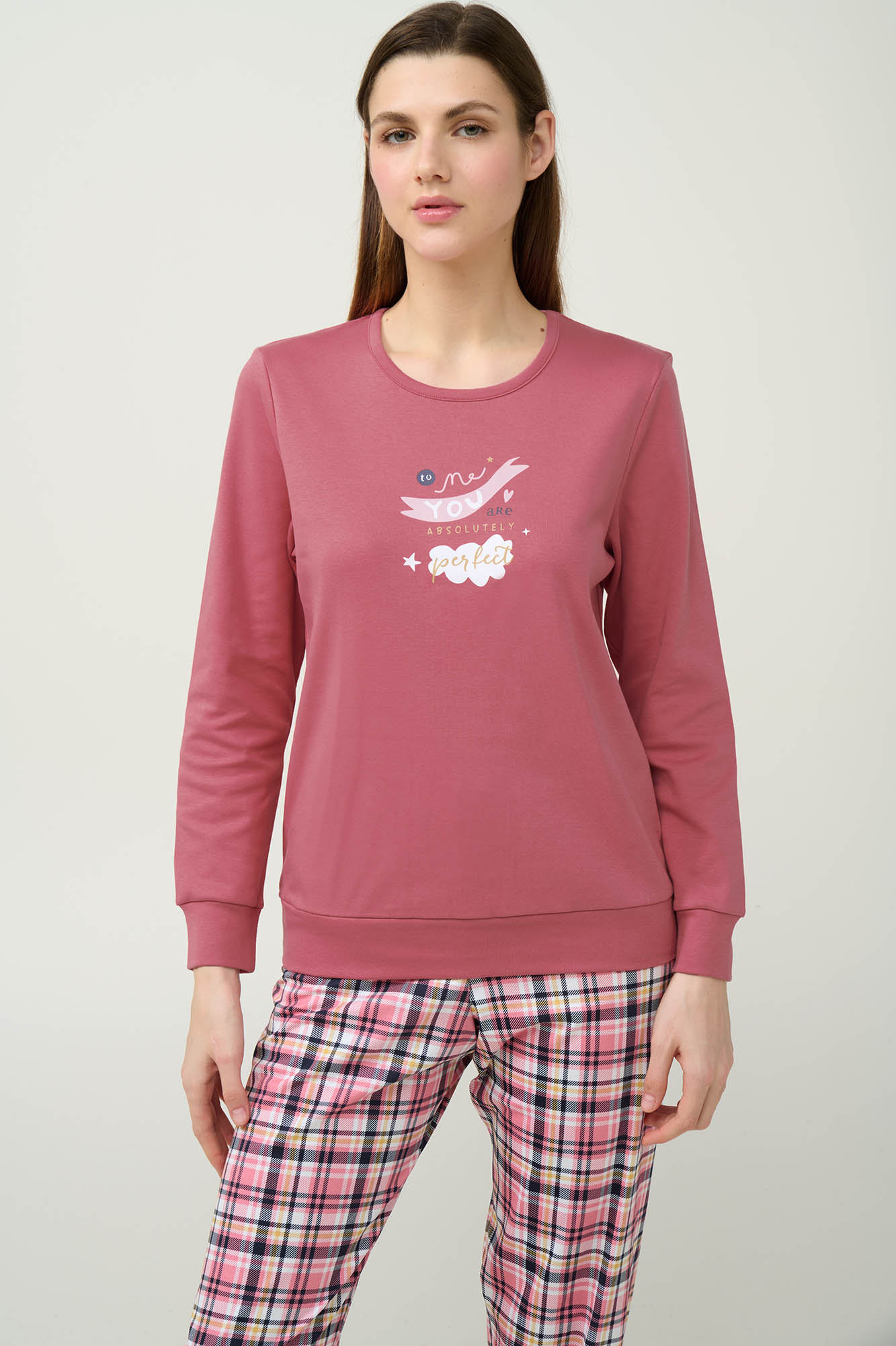Απολαύστε ζεστές χειμερινές νύχτες με αυτές τις γυναικείες πυτζάμες, κατασκευασμένες από 100% βαμβάκι s. jersey, που προσφέρει εξαιρετική διαπνοή και απαλότητα. Το πάνω μέρος διαθέτει μανίκια με μανσέτες, χαριτωμένο τύπωμα στο στήθος και λάστιχο στη μέση. Συνδυάζεται με παντελόνι σε ροζ καρό μοτίβο και μανσέτες, δημιουργώντας ένα σετ που προσφέρει βέλτιστη εφαρμογή και μέγιστη άνεση. Ιδανικό για στιγμές χαλάρωσης στο σπίτι ή έναν ήρεμο, απολαυστικό ύπνο.