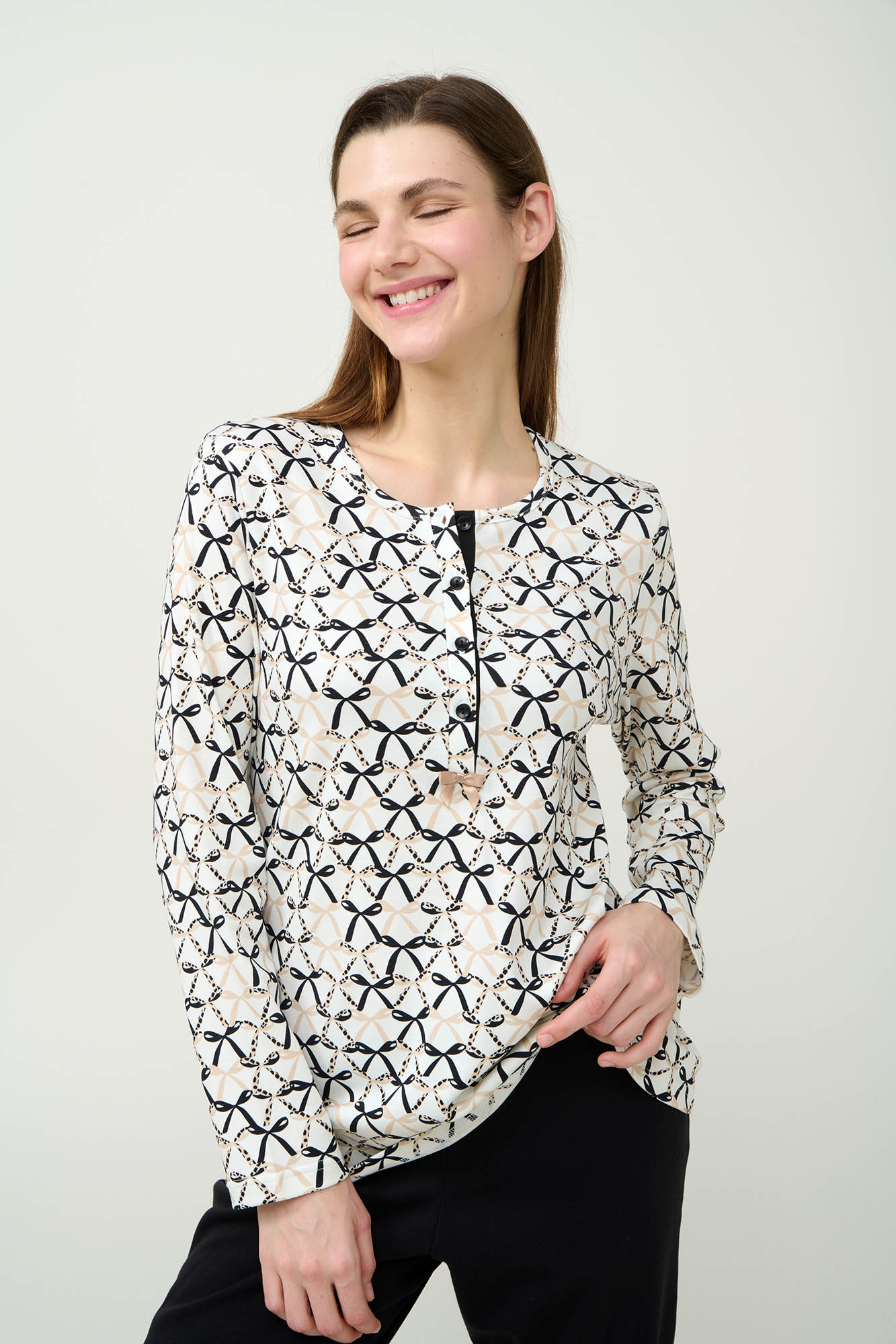 Αυτή η γυναικεία πιτζάμα είναι φτιαγμένη από απαλό και ανθεκτικό 100% βαμβακερό interlock, προσφέροντας εξαιρετική διαπνοή και άνεση. Το πάνω μέρος διαθέτει κομψό μοτίβο με φιόγκους σε όλη την επιφάνεια και πατιλέτα με κουμπιά για εύκολη εφαρμογή, συνδυάζοντας κλασικό στυλ με μοντέρνα πινελιά. Το σετ συμπληρώνεται από μονόχρωμο παντελόνι σε μαύρο χρώμα, που χαρίζει ισορροπία στο σύνολο. Ιδανική επιλογή για χαλάρωση στο σπίτι ή έναν άνετο ύπνο.
