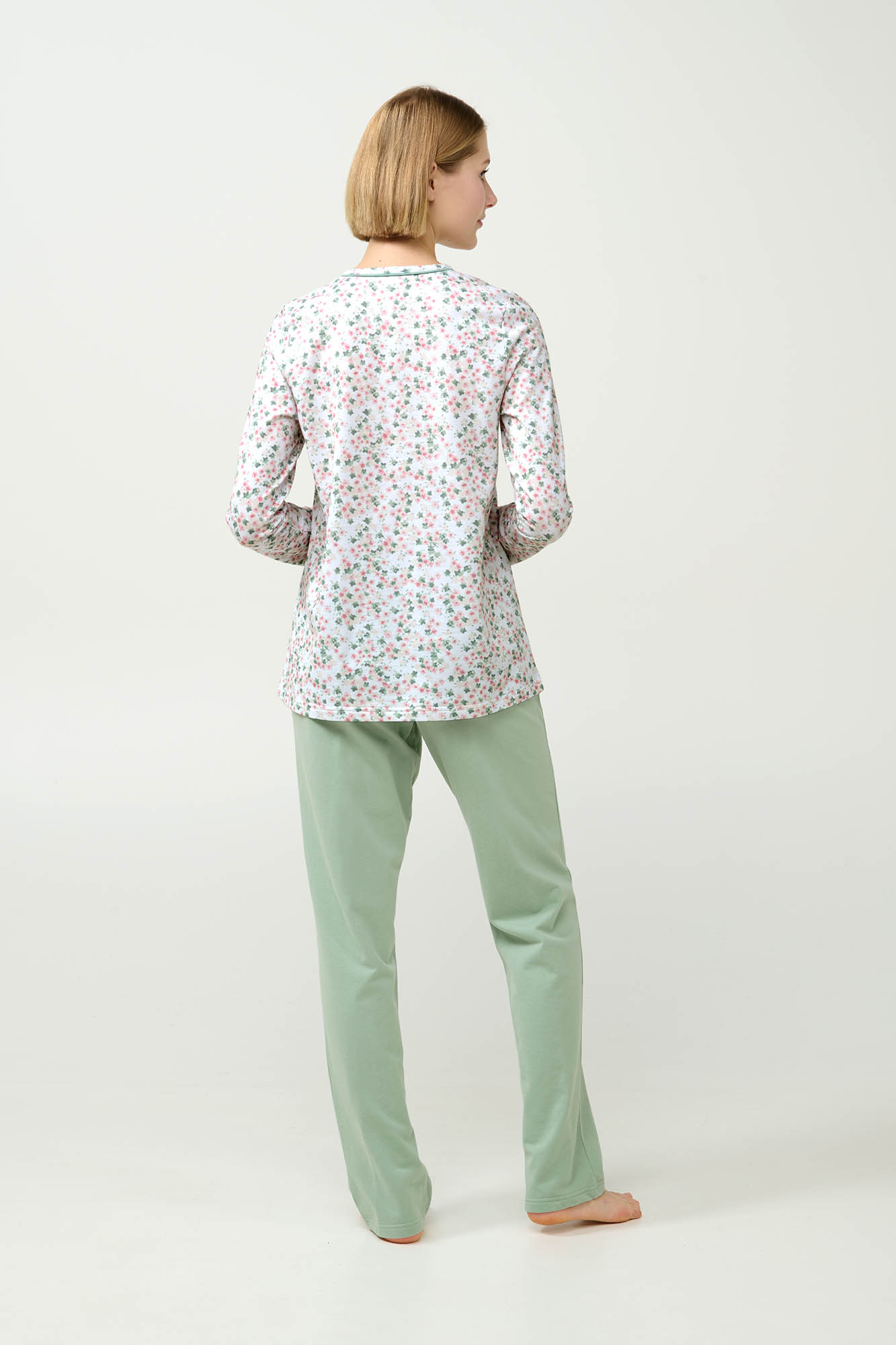 Επιλέξτε για τις κρύες ημέρες του χειμώνα ένα σετ γυναικείες πυτζάμες, κατασκευασμένο από υψηλής ποιότητας 100% βαμβάκι φούτερ που προφέρει φυσική ζεστασιά και διαπνοή. Το επάνω μέρος ξεχωρίζει με ένα ρομαντικό φλοράλ μοτίβο και κλασική πατιλέτα που προσθέτουν διαχρονική γοητεία, ενώ το μονόχρωμο παντελόνι διατηρεί χαρίζει ισορροπία στο σύνολο. Ιδανικό για στιγμές χαλάρωσης ή έναν ήρεμο ύπνο.