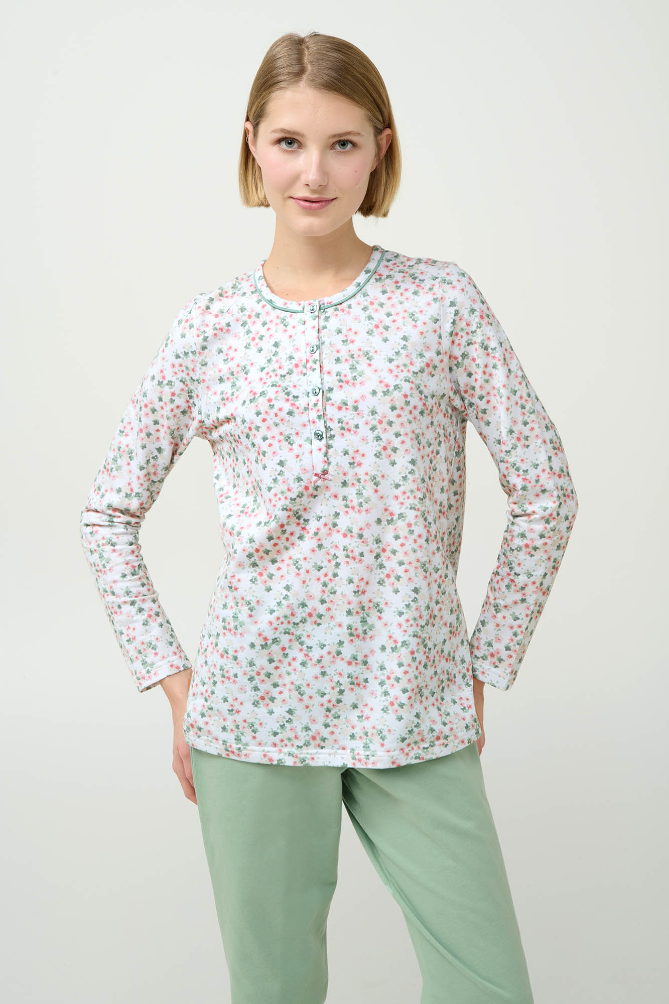 Επιλέξτε για τις κρύες ημέρες του χειμώνα ένα σετ γυναικείες πυτζάμες, κατασκευασμένο από υψηλής ποιότητας 100% βαμβάκι φούτερ που προφέρει φυσική ζεστασιά και διαπνοή. Το επάνω μέρος ξεχωρίζει με ένα ρομαντικό φλοράλ μοτίβο και κλασική πατιλέτα που προσθέτουν διαχρονική γοητεία, ενώ το μονόχρωμο παντελόνι διατηρεί χαρίζει ισορροπία στο σύνολο. Ιδανικό για στιγμές χαλάρωσης ή έναν ήρεμο ύπνο.