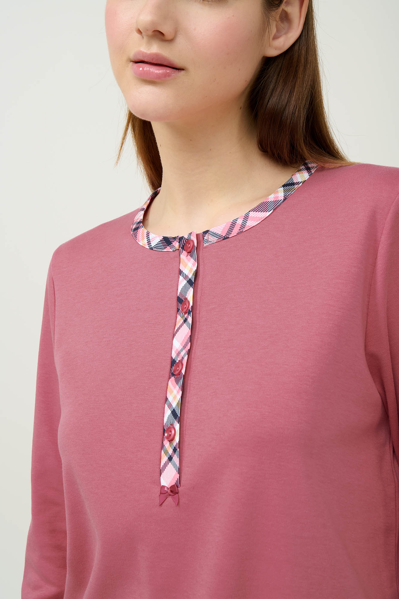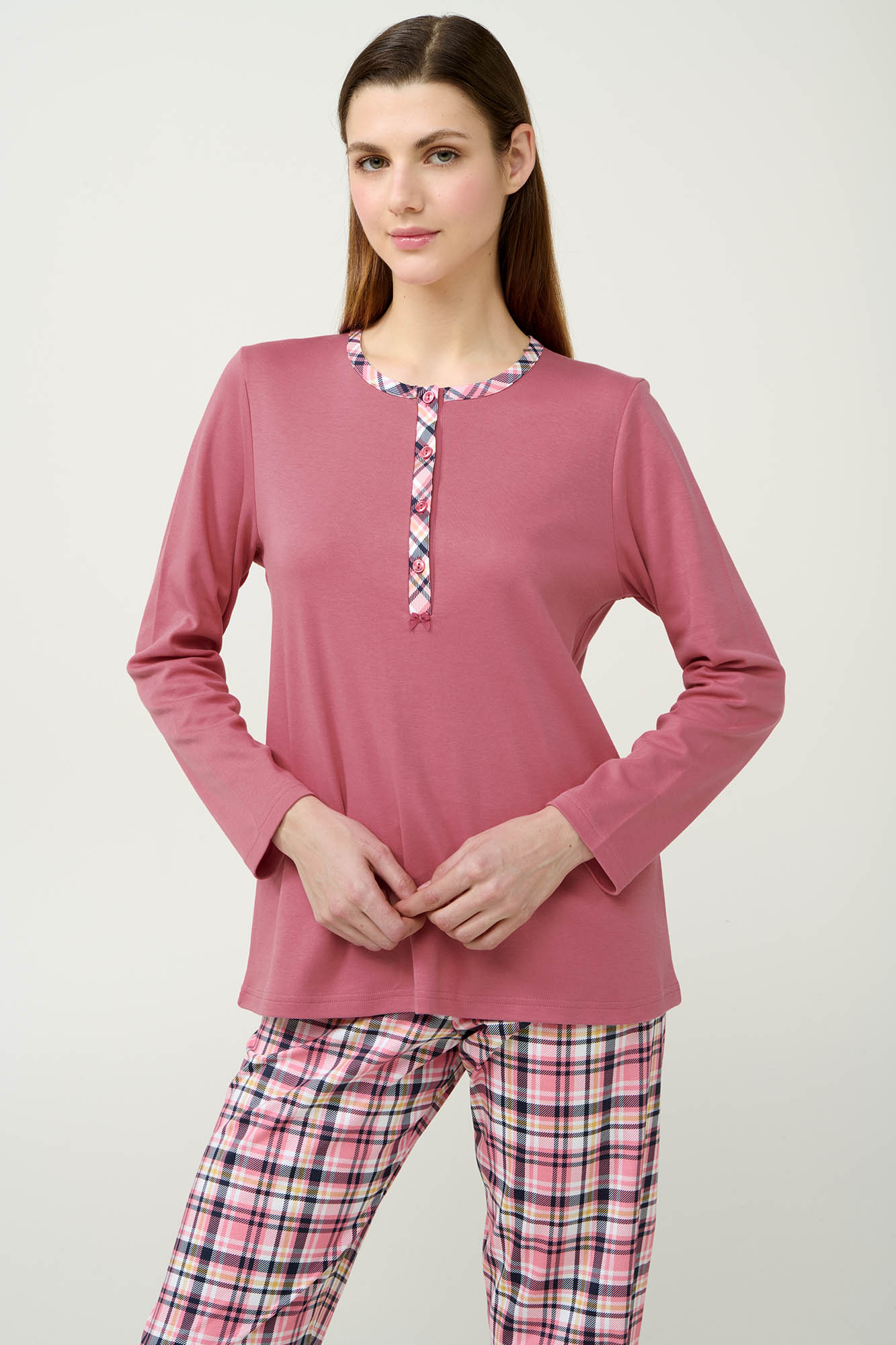 Επιλέξτε ένα σετ χειμερινές γυναικείες πυτζάμες, κατασκευασμένες από 100% βαμβάκι s. jersey για απαλή και διαπνέουσα αίσθηση. Το επάνω μέρος διαθέτει πατιλέτα και μακριά μανίκια. Συνδυάζεται με καρό παντελόνι σε απαλές ροζ αποχρώσεις, δημιουργώντας την τέλεια ισορροπία ανάμεσα στη χαριτωμένη διάθεση και την καθημερινή άνεση. Μια ιδανική πρόταση για τις στιγμές χαλάρωσης στο σπίτι και έναν ήρεμο βραδινό ύπνο.