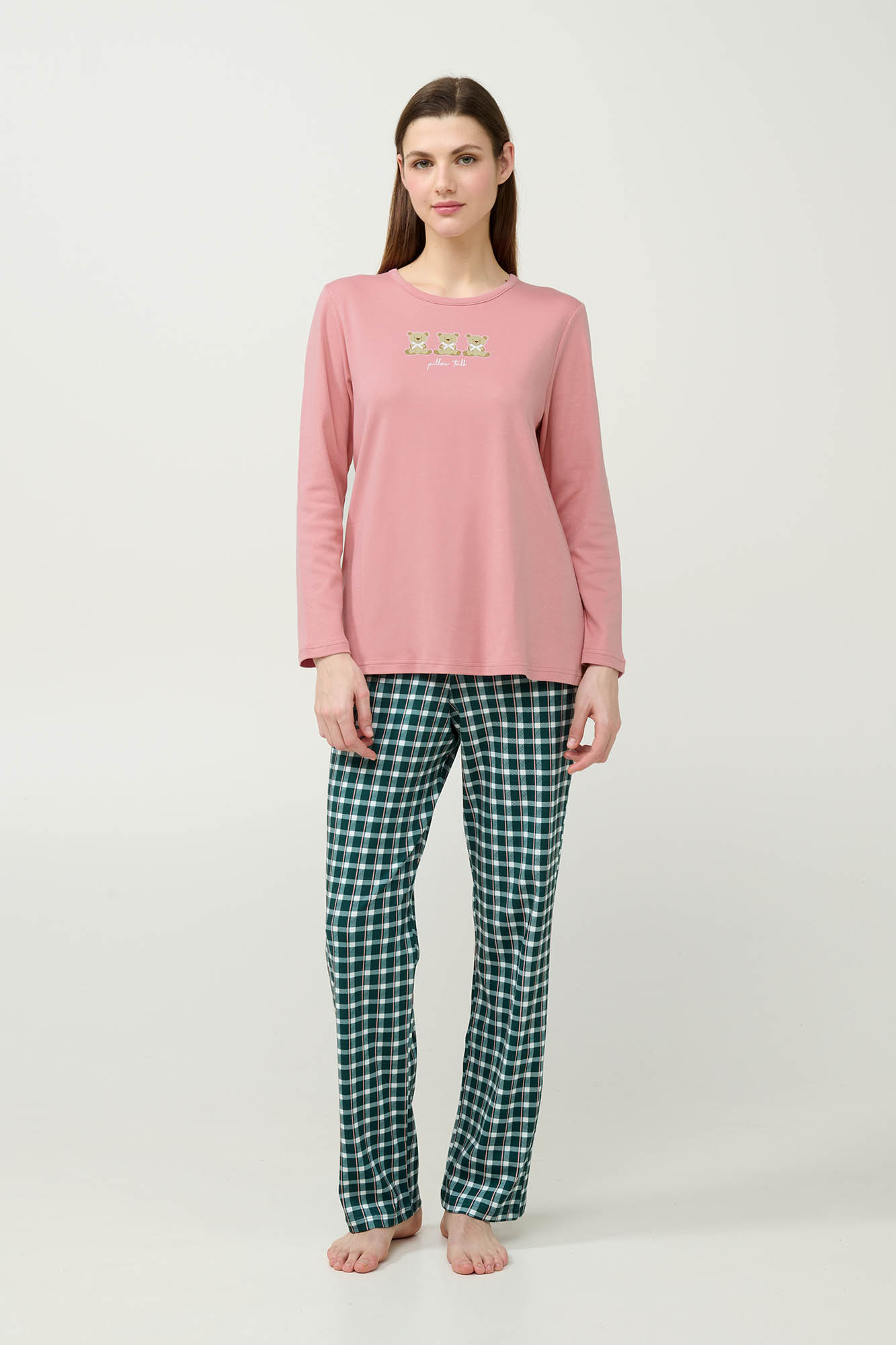 Ανανεώστε τη συλλογή σας με αυτές τις 100% βαμβακερές γυναικείες πυτζάμες, που χαρίζουν απαλή αίσθηση στο σώμα, επιτρέποντας στο δέρμα να αναπνέει. Αποτελείται από τοπ σε απαλή ροζ απόχρωση με ένα χαριτωμένο τύπωμα με αρκουδάκια στο στήθος που προσθέτει μια ανάλαφρη νότα. Συνδυάζεται με παντελόνι σε διαχρονικό πράσινο καρό μοτίβο με λεπτές ροζ γραμμές, δημιουργώντας έναν συνδυασμό νεανικής διάθεσης και κλασικής γοητείας.
