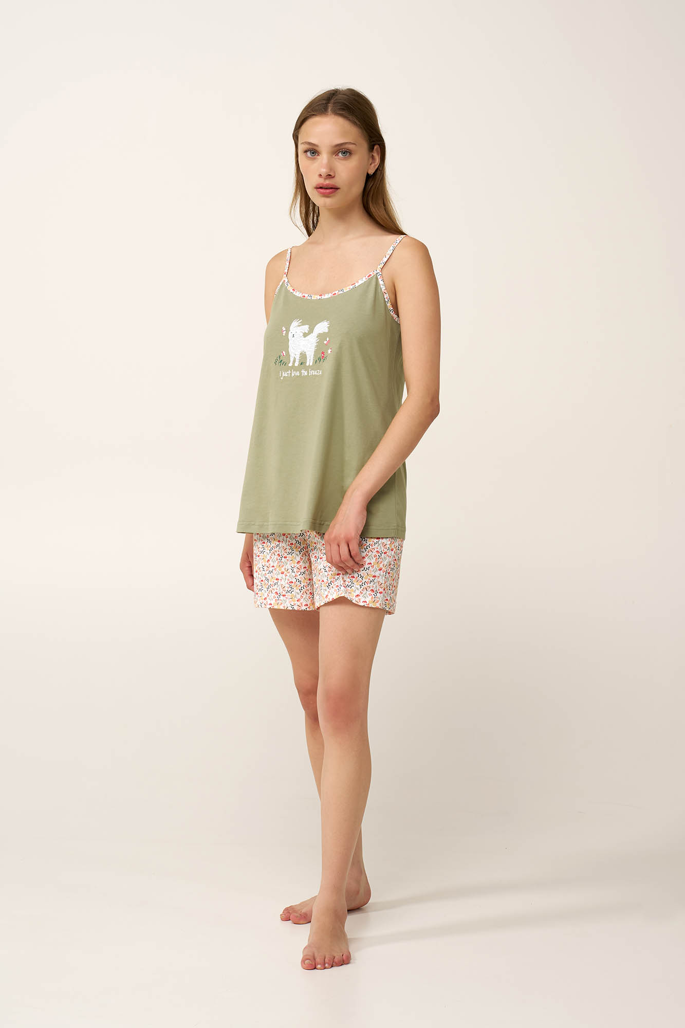 Απολαύστε την απόλυτη άνεση που προσφέρει αυτό το γλυκό και θηλυκό baby doll σετ, σχεδιασμένο για χαλαρές καλοκαιρινές νύχτες. Κατασκευασμένο από διαπνέον 100% βαμβάκι single jersey, προσφέρει ανάλαφρη και δροσερή αίσθηση στο σώμα. Το τοπ με λεπτές τιράντες χαρίζει αέρινη εφαρμογή και ολοκληρώνεται με ένα χαριτωμένο print, ενώ το σορτσάκι διακοσμείται με ένα δροσερό μοτίβο από πεταλούδες και αγριολούλουδα, εμπνευσμένο από έναν ανθισμένο ανοιξιάτικο κήπο. Ιδανικό για χαλάρωση, ξεκούραση και απολαυστικά βράδια.