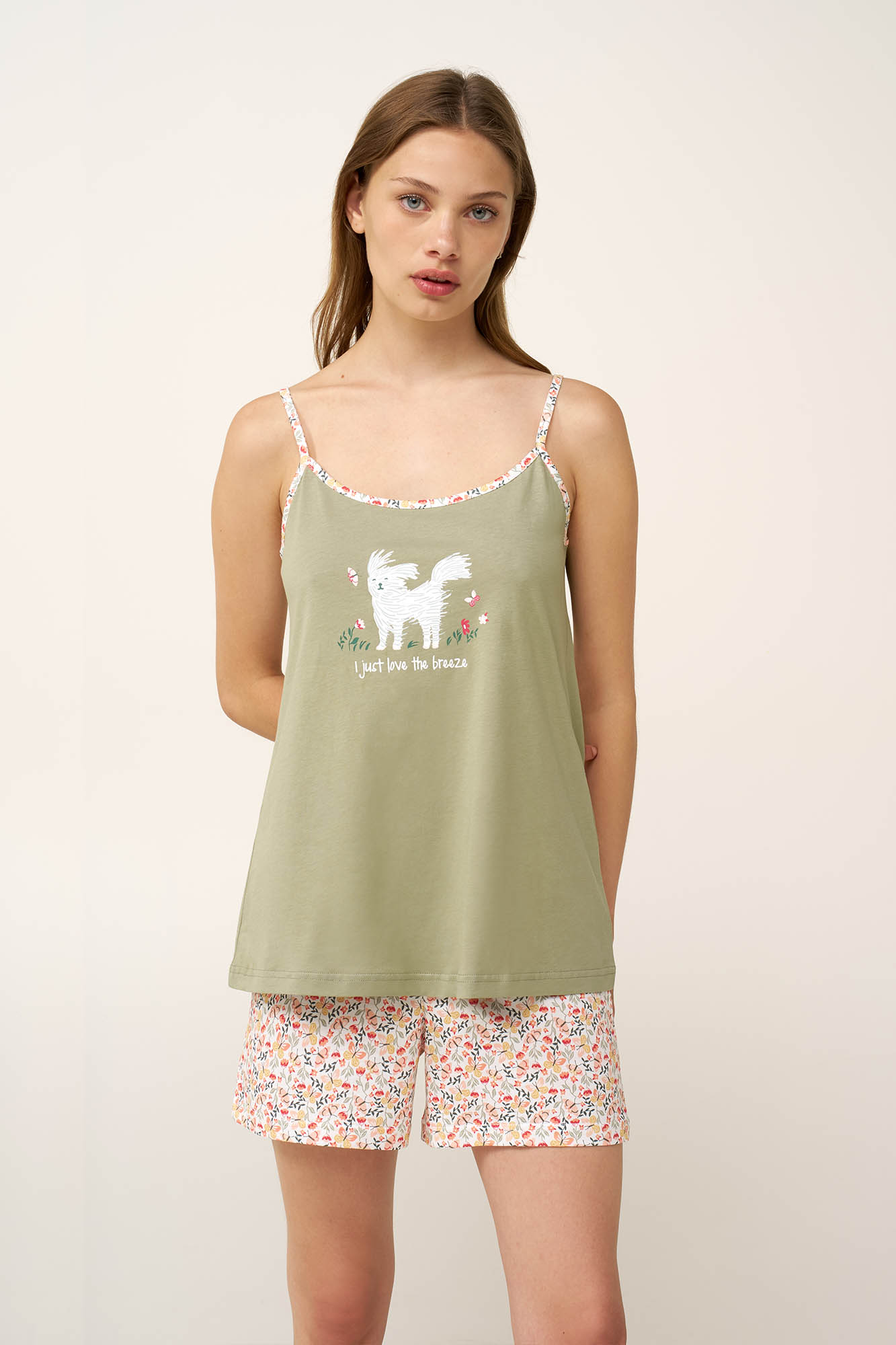Απολαύστε την απόλυτη άνεση που προσφέρει αυτό το γλυκό και θηλυκό baby doll σετ, σχεδιασμένο για χαλαρές καλοκαιρινές νύχτες. Κατασκευασμένο από διαπνέον 100% βαμβάκι single jersey, προσφέρει ανάλαφρη και δροσερή αίσθηση στο σώμα. Το τοπ με λεπτές τιράντες χαρίζει αέρινη εφαρμογή και ολοκληρώνεται με ένα χαριτωμένο print, ενώ το σορτσάκι διακοσμείται με ένα δροσερό μοτίβο από πεταλούδες και αγριολούλουδα, εμπνευσμένο από έναν ανθισμένο ανοιξιάτικο κήπο. Ιδανικό για χαλάρωση, ξεκούραση και απολαυστικά βράδια.