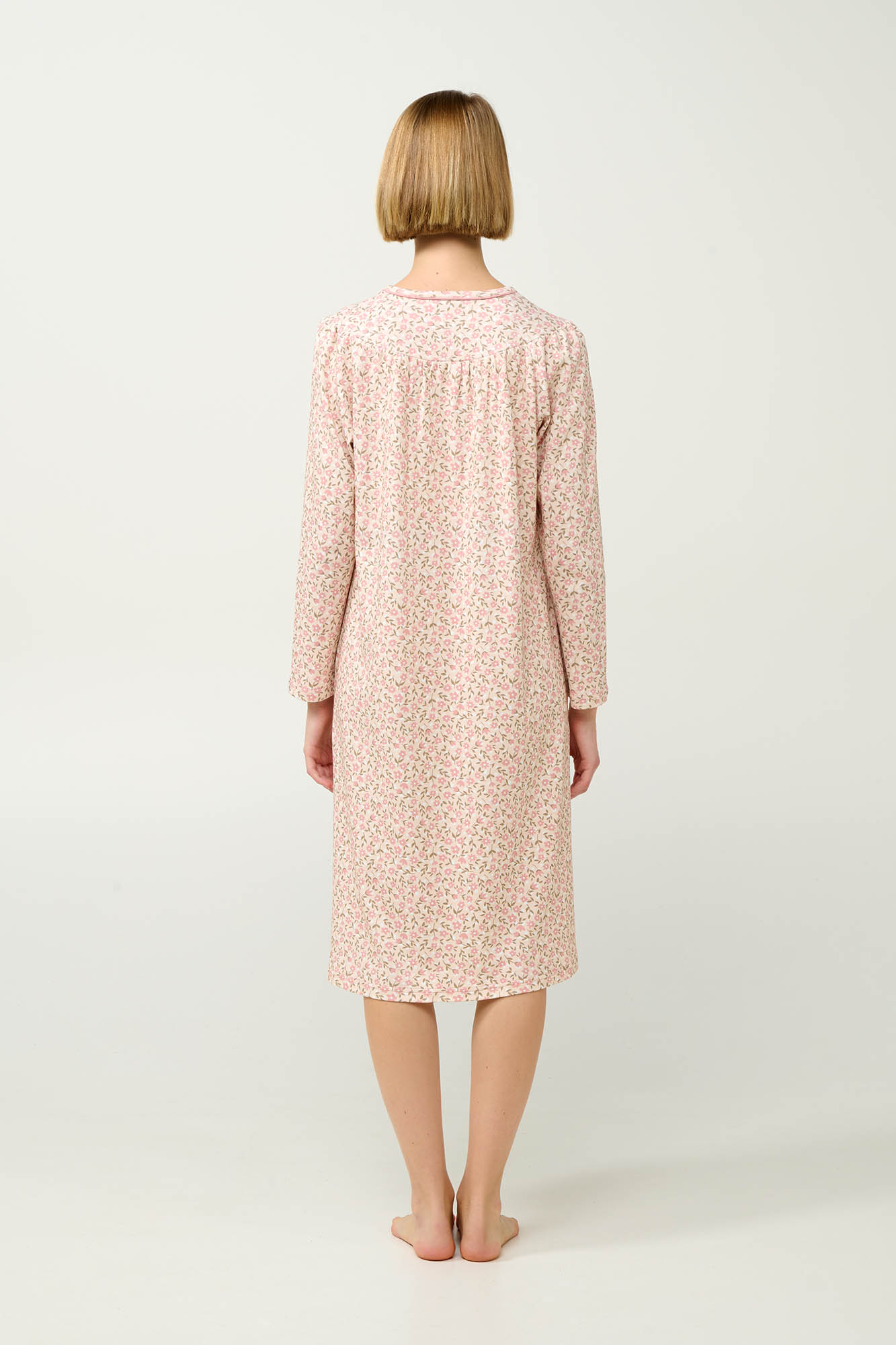 Προσθέστε στη συλλογή σας ένα κλασικό νυχτικό από 100% βαμβάκι interlock, που προσφέρει απαλή, διαπνέουσα αίσθηση στο δέρμα. Σχεδιασμένο με πατιλέτα και μακριά μανίκια σε απαλό ροζ φλοράλ μοτίβο που χαρίζει διακριτική θηλυκότητα και ρομαντικό χαρακτήρα. Ιδανικό για ήρεμα βράδια και χαλαρά πρωινά, αυτό το διαχρονικό σχέδιο συνδυάζει κομψότητα και άνεση στην καθημερινότητά σας.