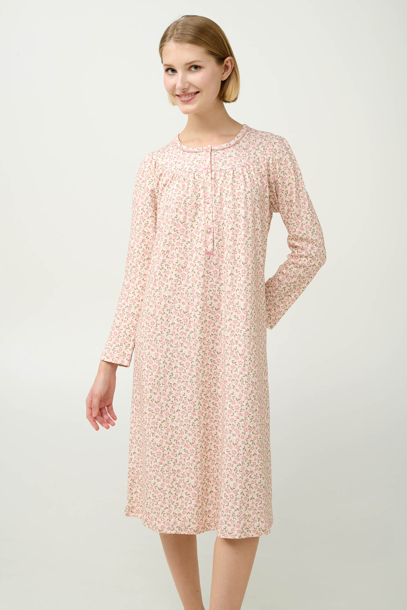 Προσθέστε στη συλλογή σας ένα κλασικό νυχτικό από 100% βαμβάκι interlock, που προσφέρει απαλή, διαπνέουσα αίσθηση στο δέρμα. Σχεδιασμένο με πατιλέτα και μακριά μανίκια σε απαλό ροζ φλοράλ μοτίβο που χαρίζει διακριτική θηλυκότητα και ρομαντικό χαρακτήρα. Ιδανικό για ήρεμα βράδια και χαλαρά πρωινά, αυτό το διαχρονικό σχέδιο συνδυάζει κομψότητα και άνεση στην καθημερινότητά σας.