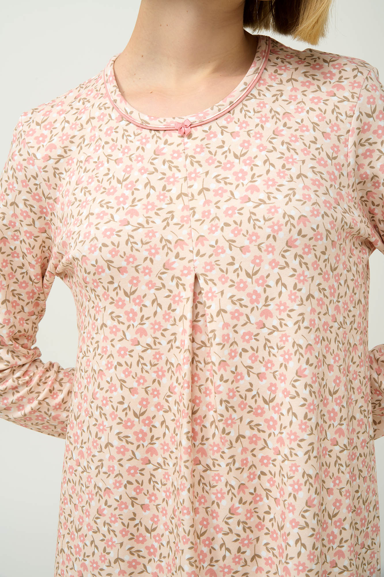 Επιλέξτε ένα χειμερινό νυχτικό από 100% βαμβάκι interlock που επιτρέπει στο δέρμα να αναπνέει. Το απαλό ροζ φλοράλ μοτίβο προσθέτει μια διαχρονική, θηλυκή νότα, ενώ η πιέτα στο μπροστινό μέρος χαρίζει άνεση, χαλαρή εφαρμογή. Μια απαλή και άνετη επιλογή, ιδανική για χαλαρά απογεύματα στον καναπέ ή έναν ξεκούραστο βραδινό ύπνο.