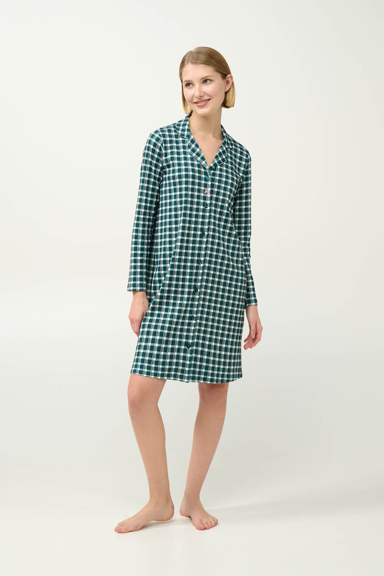 Προσθέστε στη γκαρνταρόμπα σας ένα νυχτικό, κατασκευασμένο από 100% απαλό και διαπνέον βαμβάκι interlock που θα σας χαρίσει άνεση καθ’ όλη τη διάρκεια του χειμώνα. Το διαχρονικό πράσινο καρό με λεπτές ροζ γραμμές, σε συνδυασμό με το κλασικό κουμπωτό μπροστινό μέρος, προσφέρει μια αίσθηση ανεξίτηλης κομψότητας. Ένα νυχτικό που θα αναζητάτε ξανά και ξανά.