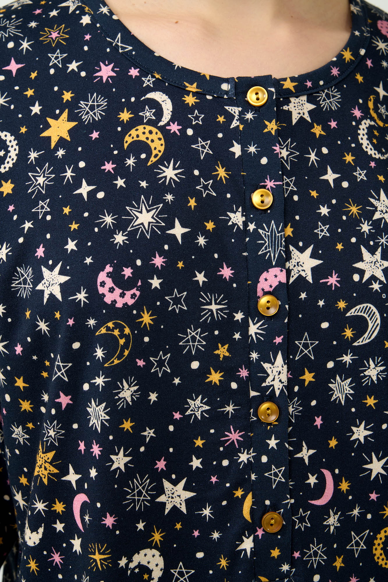 Προσθέστε μια ονειρική πινελιά στις στιγμές χαλάρωσης σας με αυτό το χειμερινό νυχτικό, κατασκευασμένο από 100% βαμβάκι s. jersey για απαλή και διαπνέουσα αίσθηση στο σώμα. Τα μακριά μανίκια και η πατιλέτα προσφέρουν διαχρονική κομψότητα, ενώ το μοτίβο με αστέρια, φεγγάρια και κοσμικά σύμβολα δίνει έναν μαγευτικό χαρακτήρα στην εμφάνισή σας. Ιδανικό για χαλάρωση ή ύπνο, συνδυάζει καθημερινή άνεση με μια δόση φαντασίας.