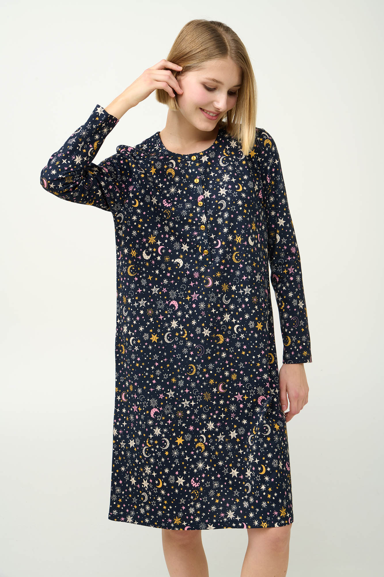 Προσθέστε μια ονειρική πινελιά στις στιγμές χαλάρωσης σας με αυτό το χειμερινό νυχτικό, κατασκευασμένο από 100% βαμβάκι s. jersey για απαλή και διαπνέουσα αίσθηση στο σώμα. Τα μακριά μανίκια και η πατιλέτα προσφέρουν διαχρονική κομψότητα, ενώ το μοτίβο με αστέρια, φεγγάρια και κοσμικά σύμβολα δίνει έναν μαγευτικό χαρακτήρα στην εμφάνισή σας. Ιδανικό για χαλάρωση ή ύπνο, συνδυάζει καθημερινή άνεση με μια δόση φαντασίας.