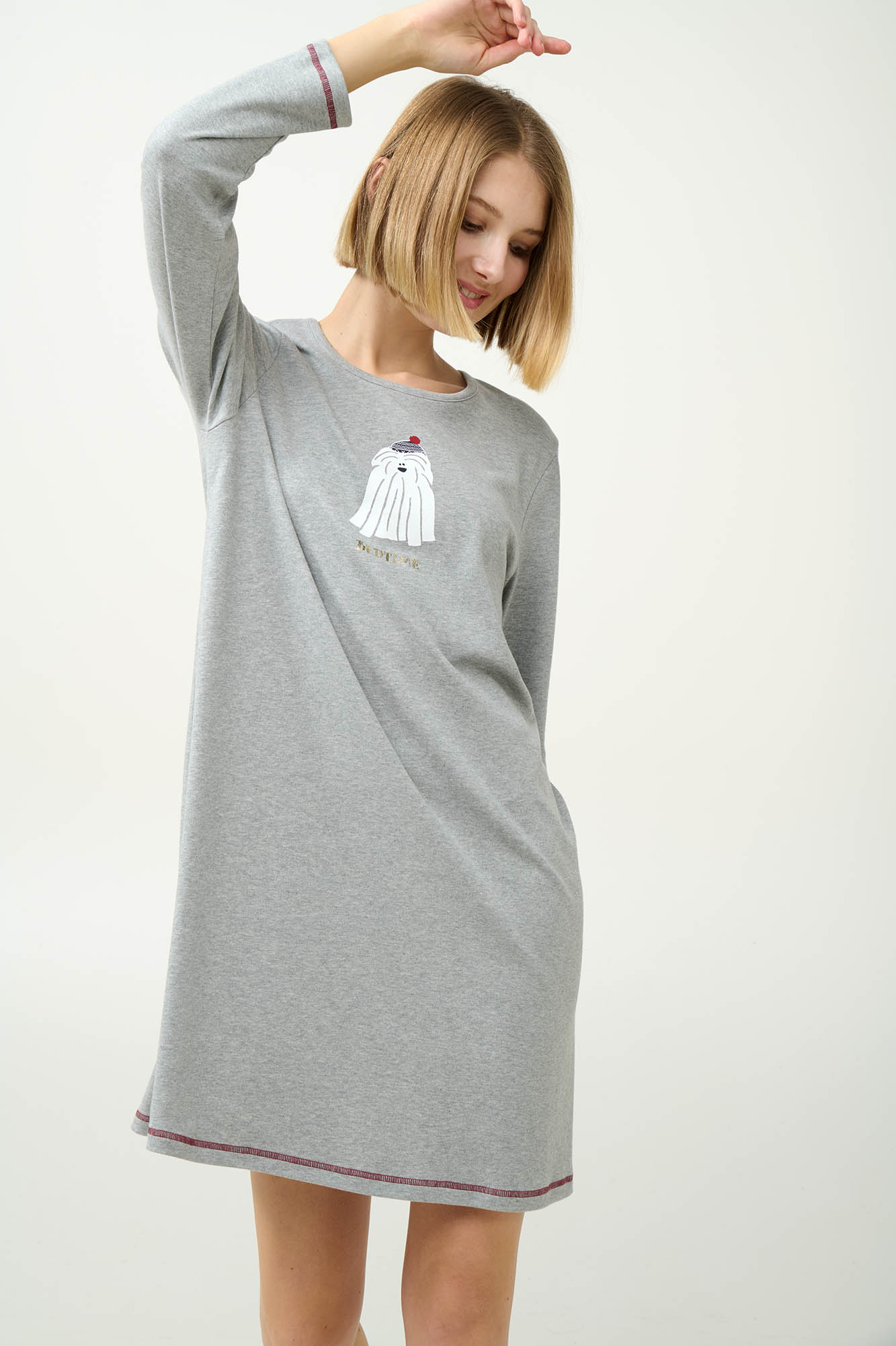 Απολαύστε κάθε στιγμή με αυτό το νυχτικό, κατασκευασμένο από 100% βαμβάκι interlock, που χαρίζει απαλότητα και εξαιρετική διαπνοή. Σχεδιασένο με μακριά μανίκια και ένα χαριτωμένο τύπωμα στο στήθος, είναι η ιδανική επιλογή είτε διαβάζετε ένα βιβλίο στο καναπέ είτε ετοιμάζεστε για έναν ξεκούραστο ύπνο.