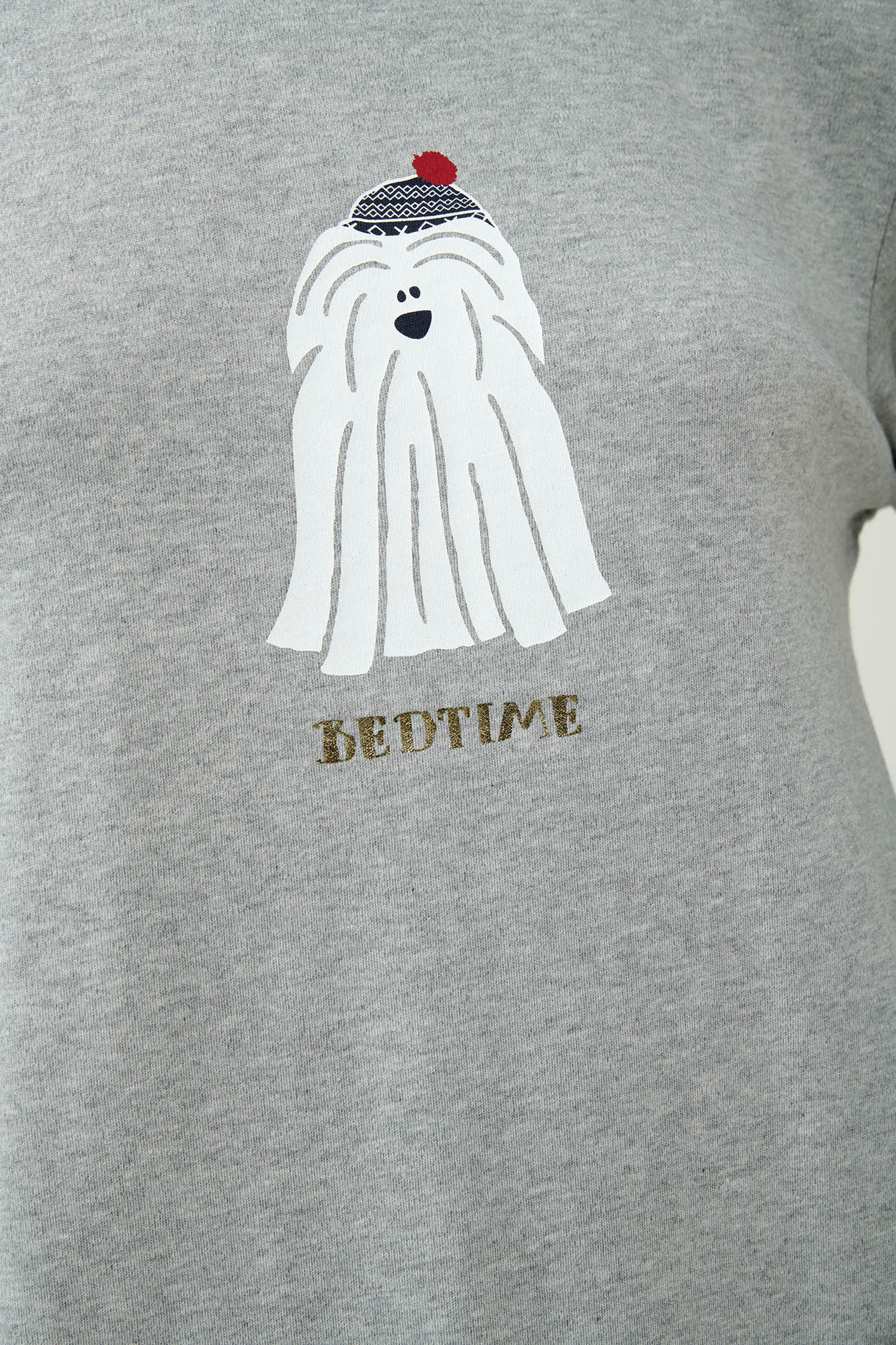 Απολαύστε κάθε στιγμή με αυτό το νυχτικό, κατασκευασμένο από 100% βαμβάκι interlock, που χαρίζει απαλότητα και εξαιρετική διαπνοή. Σχεδιασένο με μακριά μανίκια και ένα χαριτωμένο τύπωμα στο στήθος, είναι η ιδανική επιλογή είτε διαβάζετε ένα βιβλίο στο καναπέ είτε ετοιμάζεστε για έναν ξεκούραστο ύπνο.