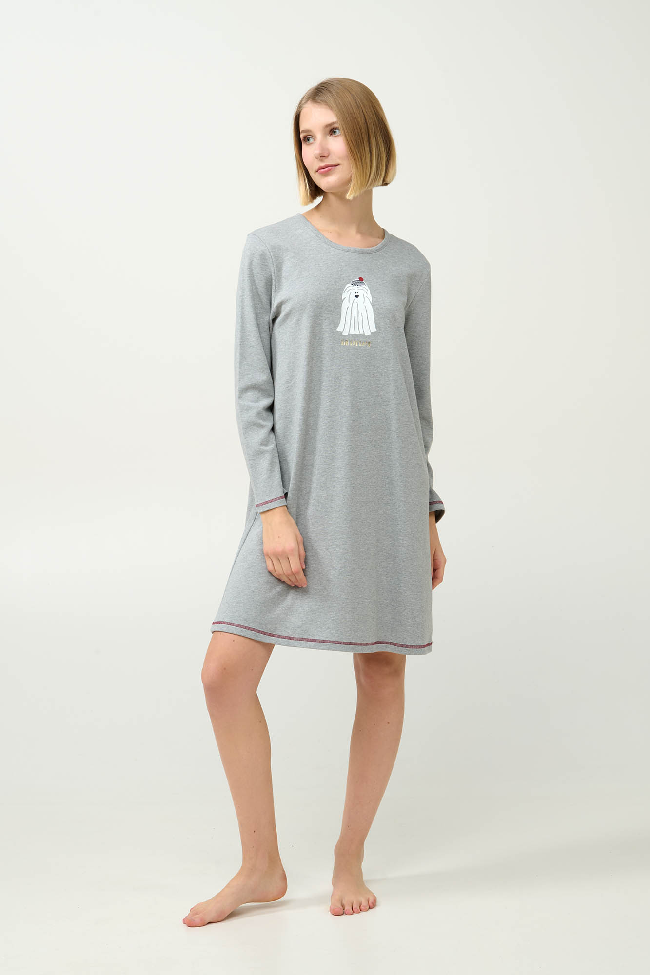 Απολαύστε κάθε στιγμή με αυτό το νυχτικό, κατασκευασμένο από 100% βαμβάκι interlock, που χαρίζει απαλότητα και εξαιρετική διαπνοή. Σχεδιασένο με μακριά μανίκια και ένα χαριτωμένο τύπωμα στο στήθος, είναι η ιδανική επιλογή είτε διαβάζετε ένα βιβλίο στο καναπέ είτε ετοιμάζεστε για έναν ξεκούραστο ύπνο.