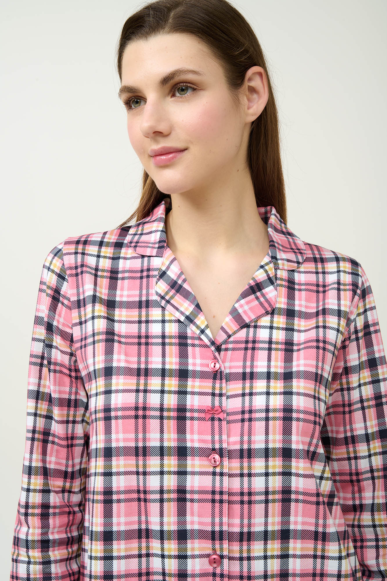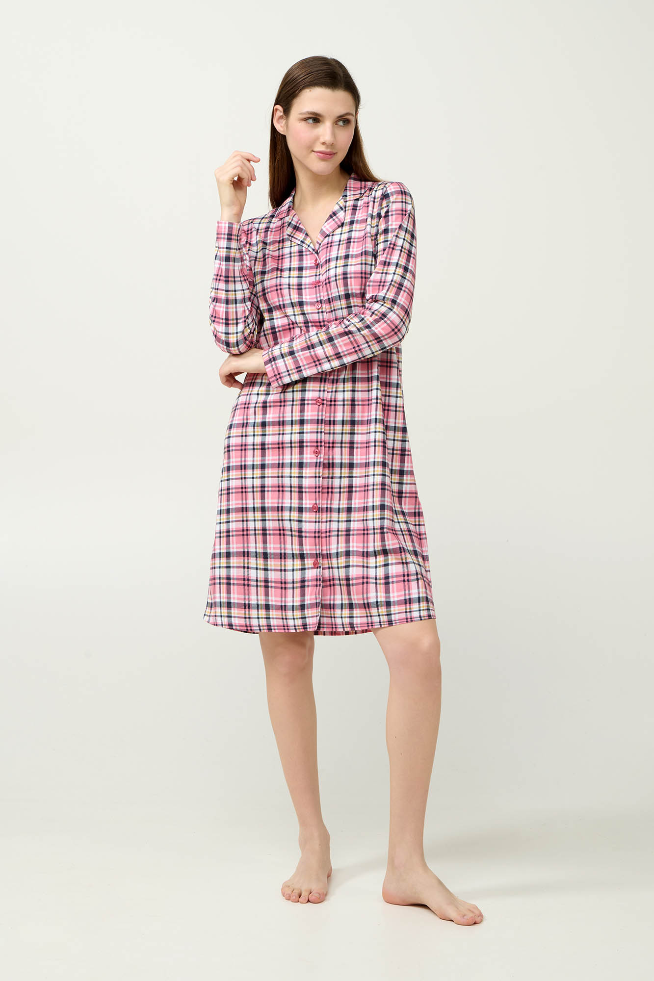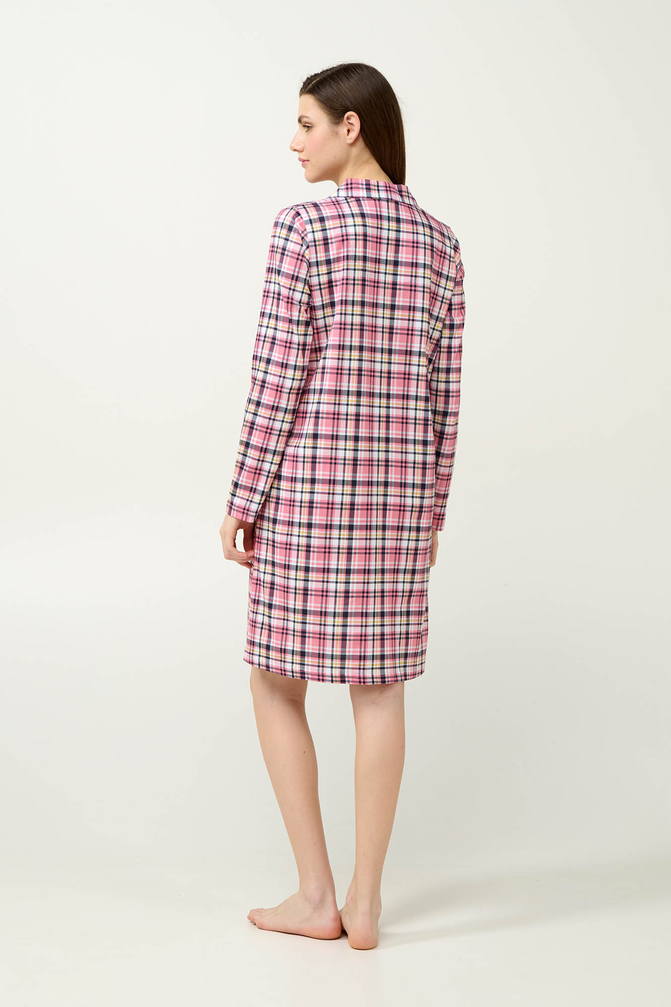 Προσθέστε στη γκαρνταρόμπα σας αυτό το χαριτωμένο αλλά κλασικό νυχτικό, κατασκευασμένο από 100% απαλό και διαπνέον βαμβάκι s. jersey. Σχεδιασμένο σε ροζ καρό μοτίβο, διαθέτει κουμπιά σε όλο το μήκος μπροστά για εύκολη εφαρμογή και διαχρονικό στυλ. Ένας συνδυασμός άνεσης και γοητείας που θα απολαύσετε στις στιγμές χαλάρωσης σας κάθε χειμώνα.