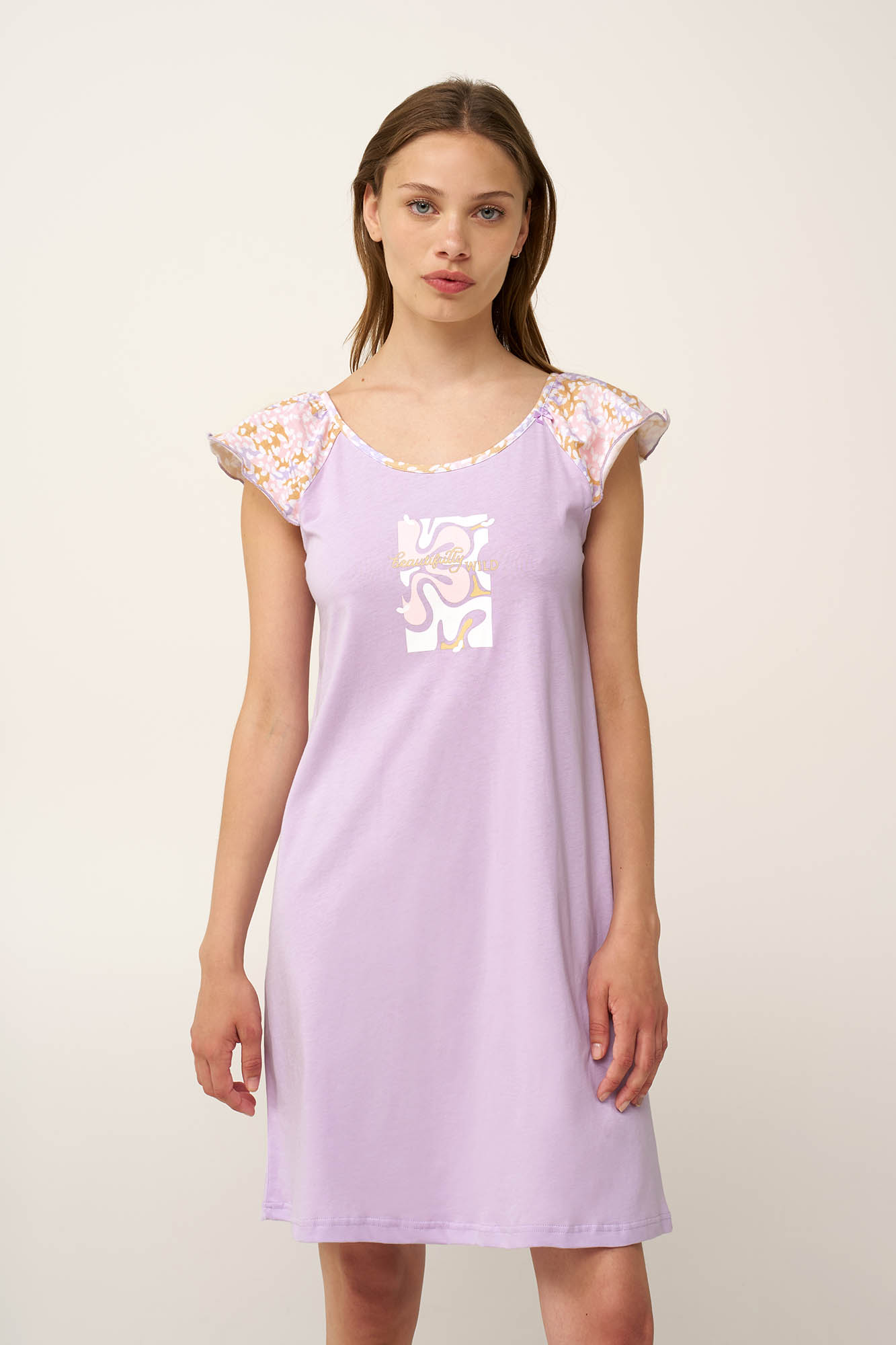 Επιλέξτε αυτό το καλοκαιρινό νυχτικό, κατασκευασμένο από απαλό και διαπνέον 100% βαμβάκι single jersey για ελαφριά και ευχάριστη αίσθηση στο σώμα. Τα μανίκια με βολάν, διακοσμημένα με παστέλ τύπωμα, προσθέτουν μια ρομαντική πινελιά. Η απαλή λιλά απόχρωση χαρίζει ηρεμία, ενώ η άνετη εφαρμογή εξασφαλίζει ελευθερία κινήσεων. Ιδανικό για να απολαύσετε ένα χαλαρό απόγευμα ή ένα δροσερό πρωινό του καλοκαιριού.
