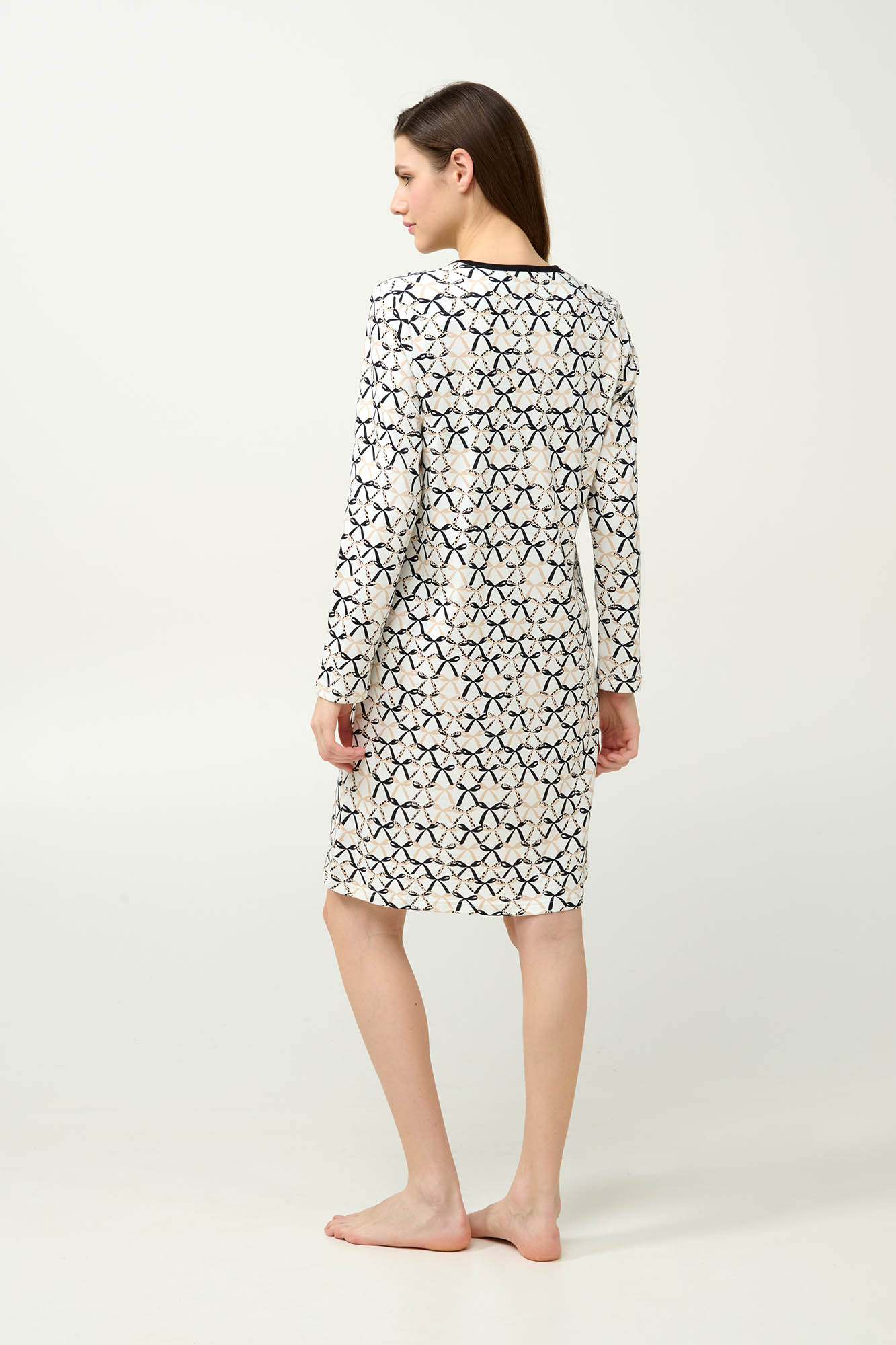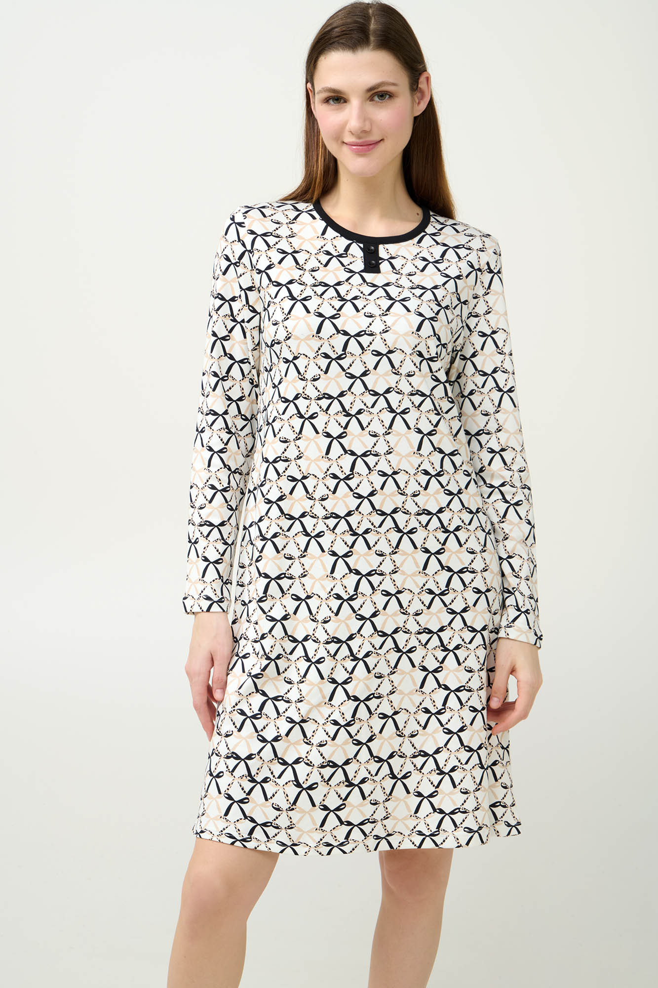 Απολαύστε κάθε στιγμή στο σπίτι με ένα νυχτικό, φτιαγμένο από 100% βαμβάκι interlock για φυσική διαπνοή και απαλότητα στο δέρμα. Διακοσμημένο με κομψό μοτίβο από φιόγκους και μακριά μανίκια, προσφέρει μια εκλεπτυσμένη εμφάνιση ιδανική για τα βράδια του χειμώνα. Σχεδιασμένο σε άνετη γραμμή για καθημερινή άνεση θα βρει τη δική του θέση στη συλλογή σας.