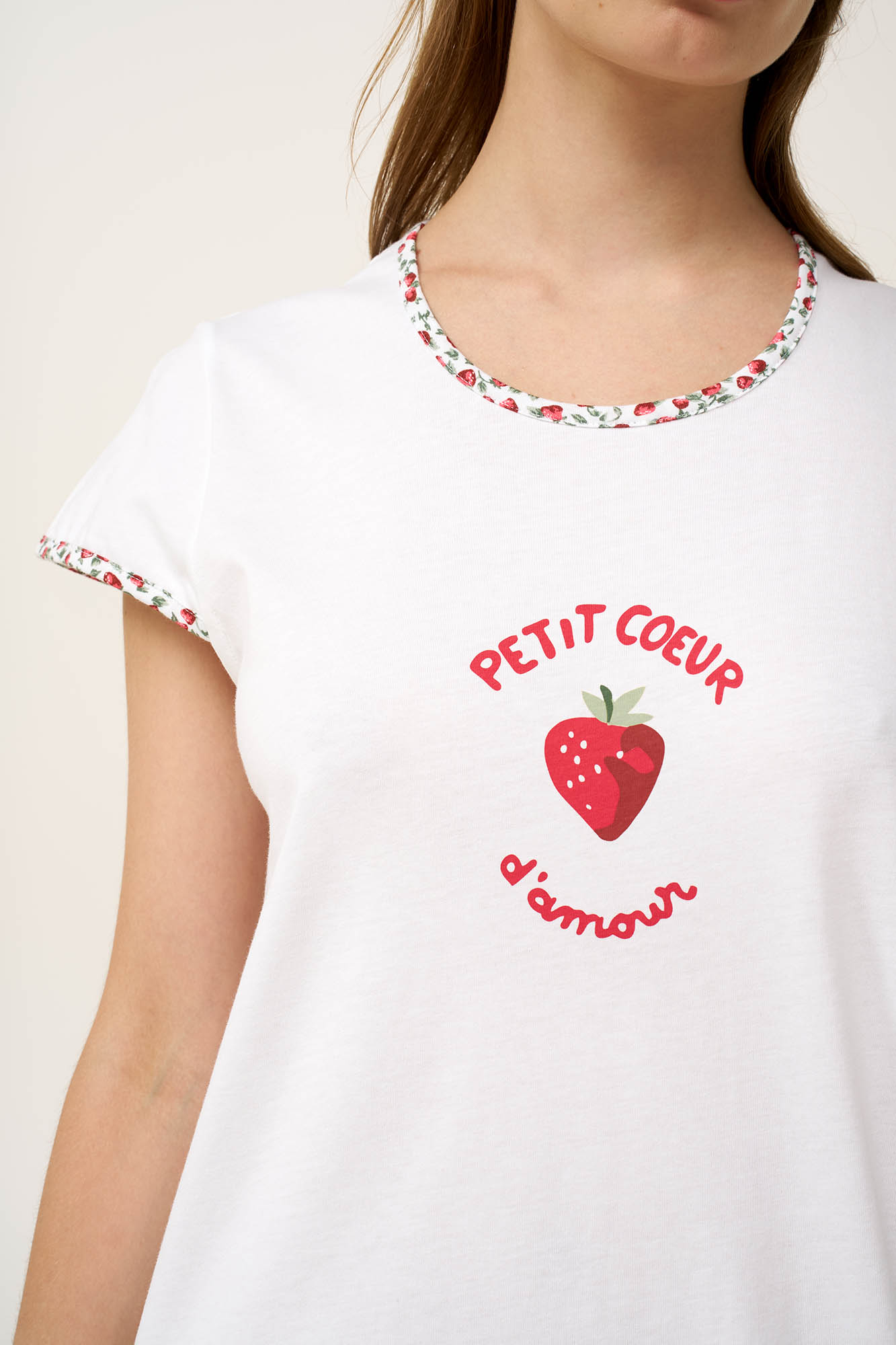 Χαλαρώστε με άνεση με αυτό το καλοκαιρινό νυχτικό, κατασκευασμένο από διαπνέον 100% βαμβάκι single jersey για ελαφριά και ευχάριστη αίσθηση στο σώμα. Ιδανικό για τις πιο ζεστές ημέρες, διαθέτει κοντά μανίκια και χαλαρή γραμμή που προσφέρει δροσιά και άνεση. Μια ζουμερή, κόκκινη φράουλα σε σχήμα καρδιάς στο στήθος, προσθέτει μια γλυκιά, νοσταλγική νότα. Απλό, άνετο κα δροσερό είναι η ιδανική επιλογή για χαλάρωση και έναν ήρεμο βραδινό ύπνο.