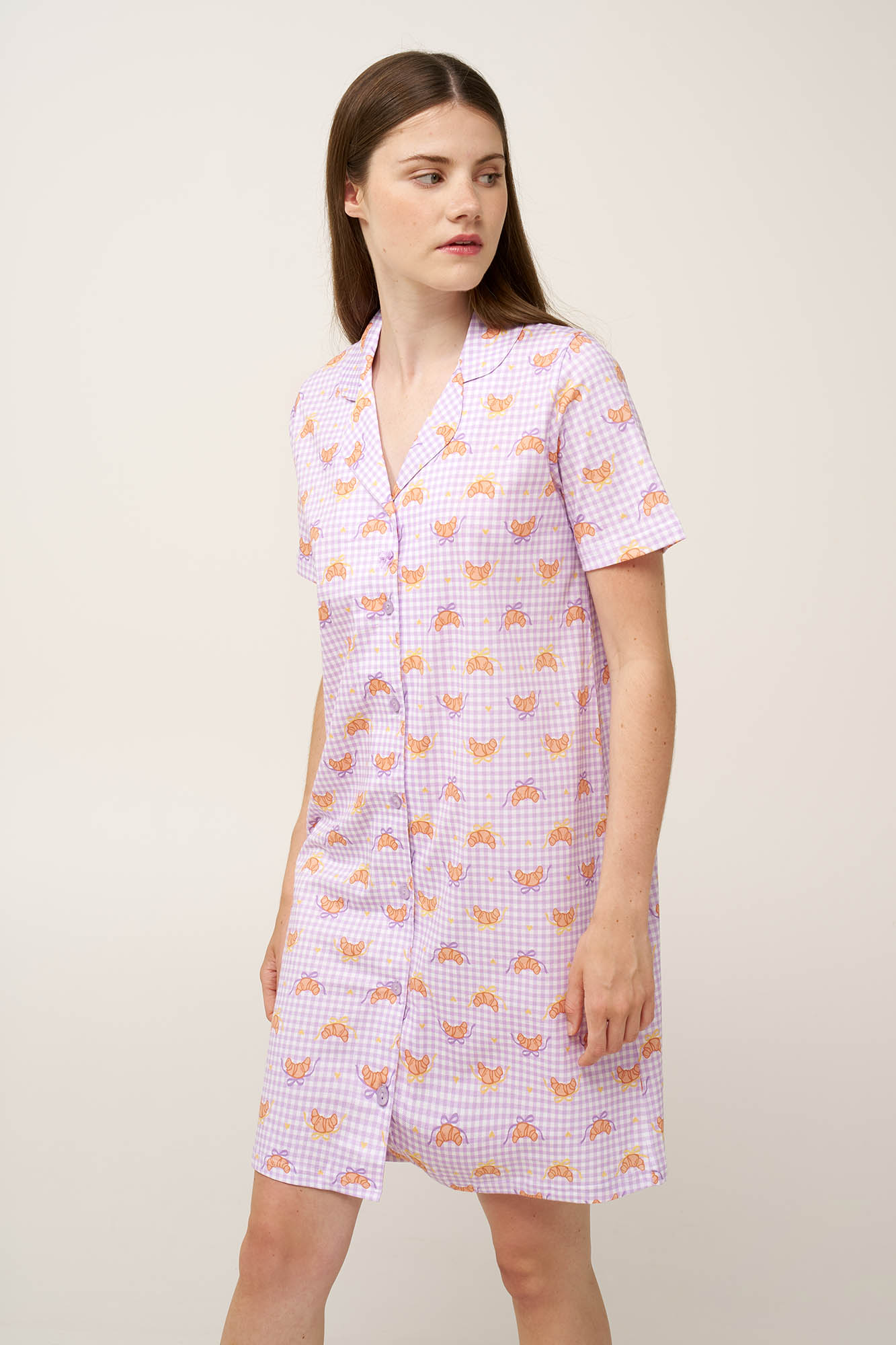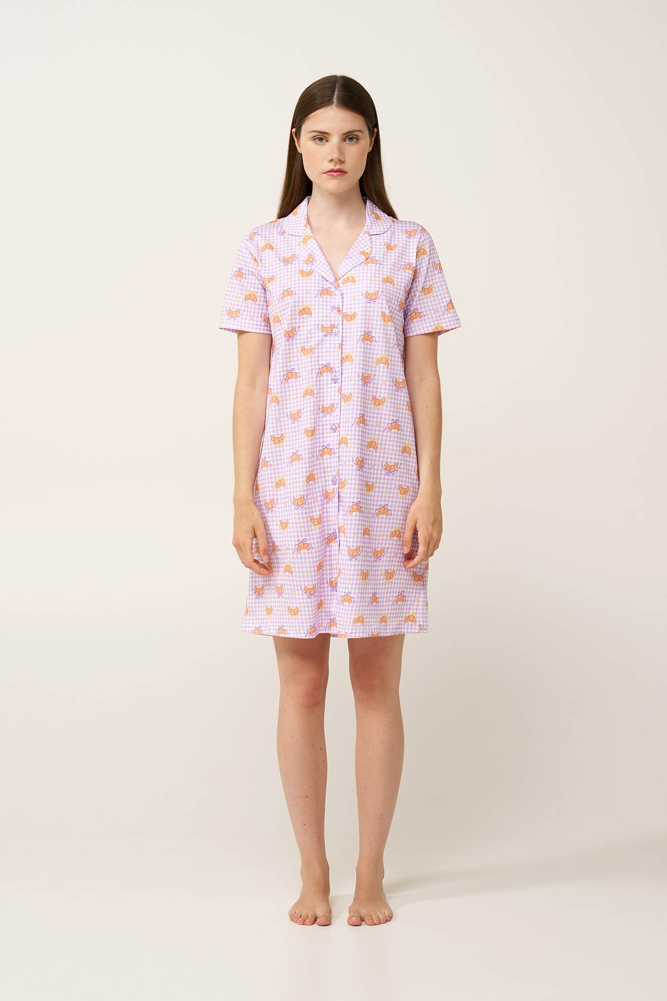 Προσθέστε στην γκαρνταρόμπα σας ένα κουμπωτό νυχτικό, κατασκευασμένο από διαπνέον 100% βαμβάκι single jersey, που προσφέρει ανάλαφρη και απαλή αίσθηση στο σώμα. Σχεδιασμένο με ένα χαριτωμένο μοτίβο από κρουασάν πάνω σε καρό gingham, χαρίζει μια γλυκιά και απαλή γοητεία σε ένα κλασικό σχέδιο, καθιστώντας το ιδανικό για χαλάρωση ή ύπνο με διακριτική θηλυκότητα.