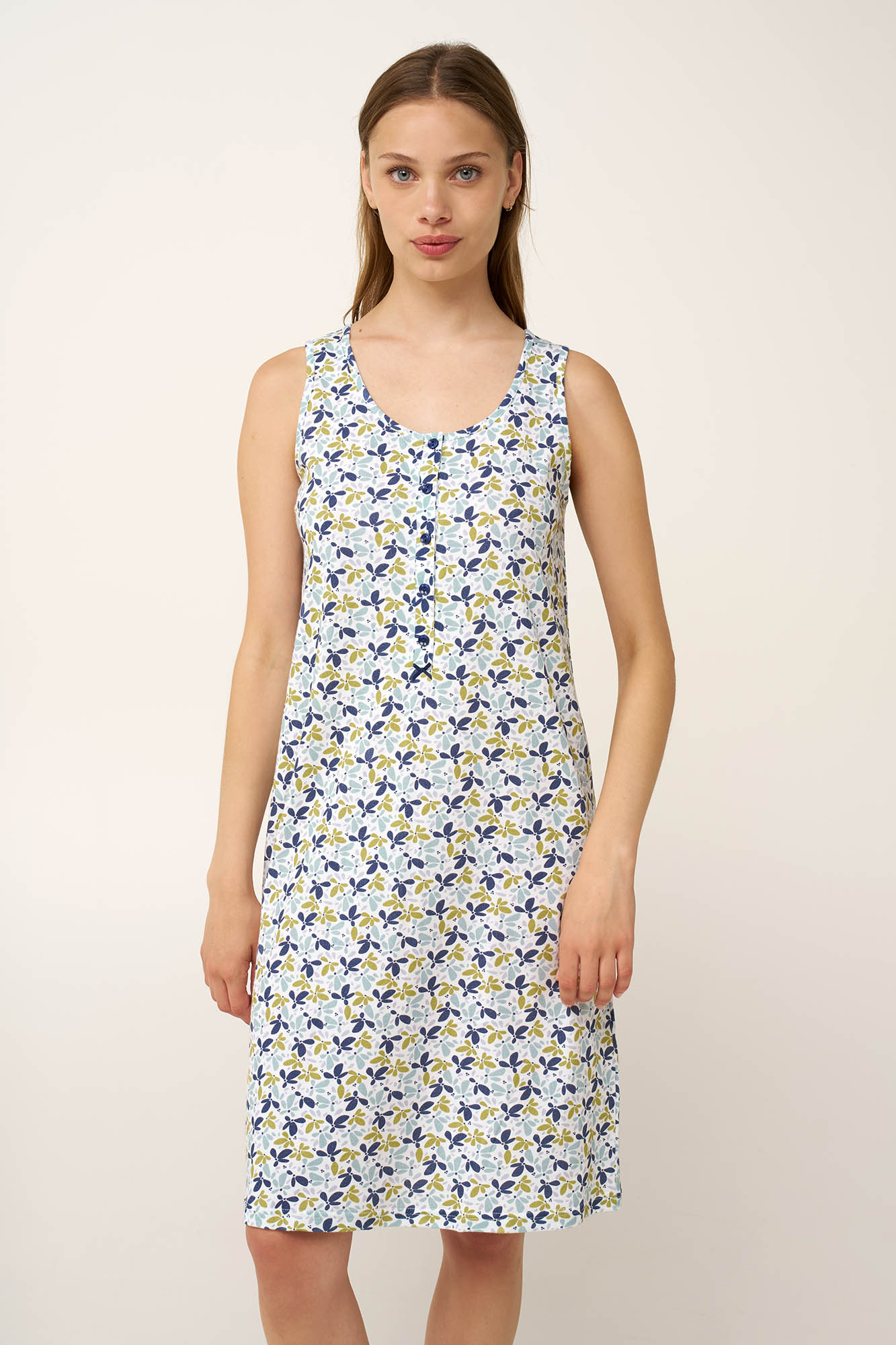 Ένας όμορφος συνδυασμός άνεσης και πρακτικότητας, αυτό το νυχτικό είναι κατασκευασμένο από απαλό και διαπνέον 100% βαμβάκι single jersey, ιδανικό για τις ζεστές καλοκαιρινές ημέρες. Η πατιλέτα διευκολύνει, ενώ παράλληλα προσθέτει μια κλασική, διαχρονική νότα. Σχεδιασμένο με ένα μοτίβο από φύλλα σε απαλές γήινες αποχρώσεις, που χαρίζει φρεσκάδα και ηρεμία. Μια εύκολη επιλογή για ξεκούραση, χαλάρωση και καθημερινές στιγμές άνεσης.