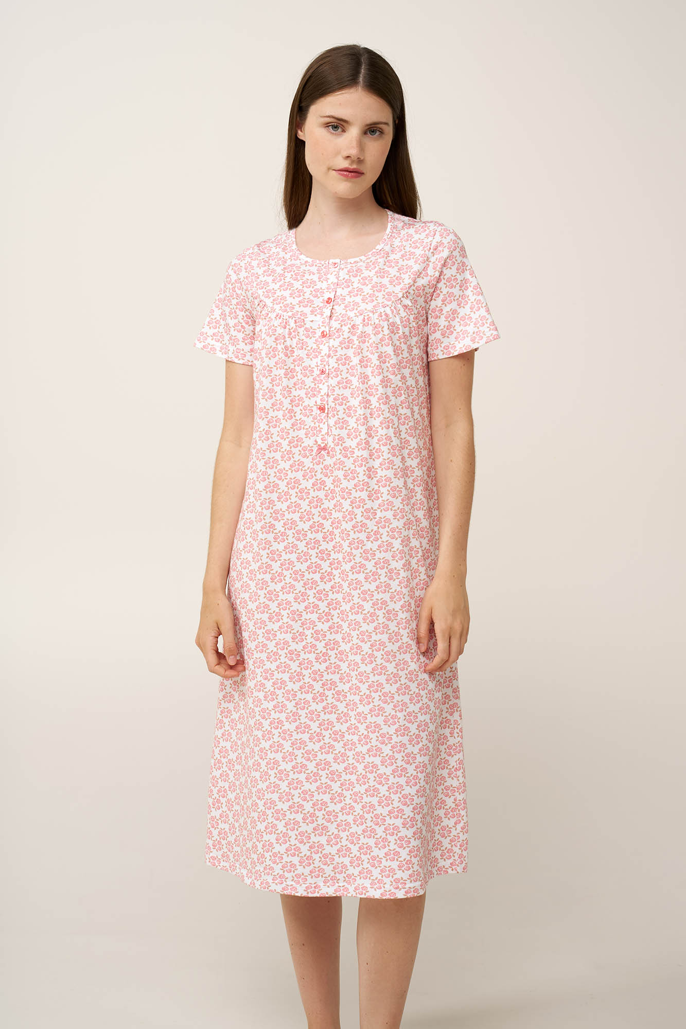 Ανακάλυψε τη διαχρονική κομψότητα που χαρίζει αυτό το καλοκαιρινό νυχτικό, κατασκευασμένο από απαλό και διαπνέον 100% βαμβάκι single jersey. Η πατιλέτα στο στήθος προσθέτει μια κλασική νότα, ενώ οι διακριτικές σούρες στο στήθος ενισχύουν τη θηλυκή του γοητεία Διακοσμημένο με ρομαντικό μοτίβο από τριαντάφυλλα σε ιβουάρ βάση, αποπνέει μια νοσταλγική, διαχρονική γοητεία. Μια εύκολη επιλογή για έναν ξεκούραστο ύπνο ή ένα χαλαρό απόγευμα μετά τη δουλεία