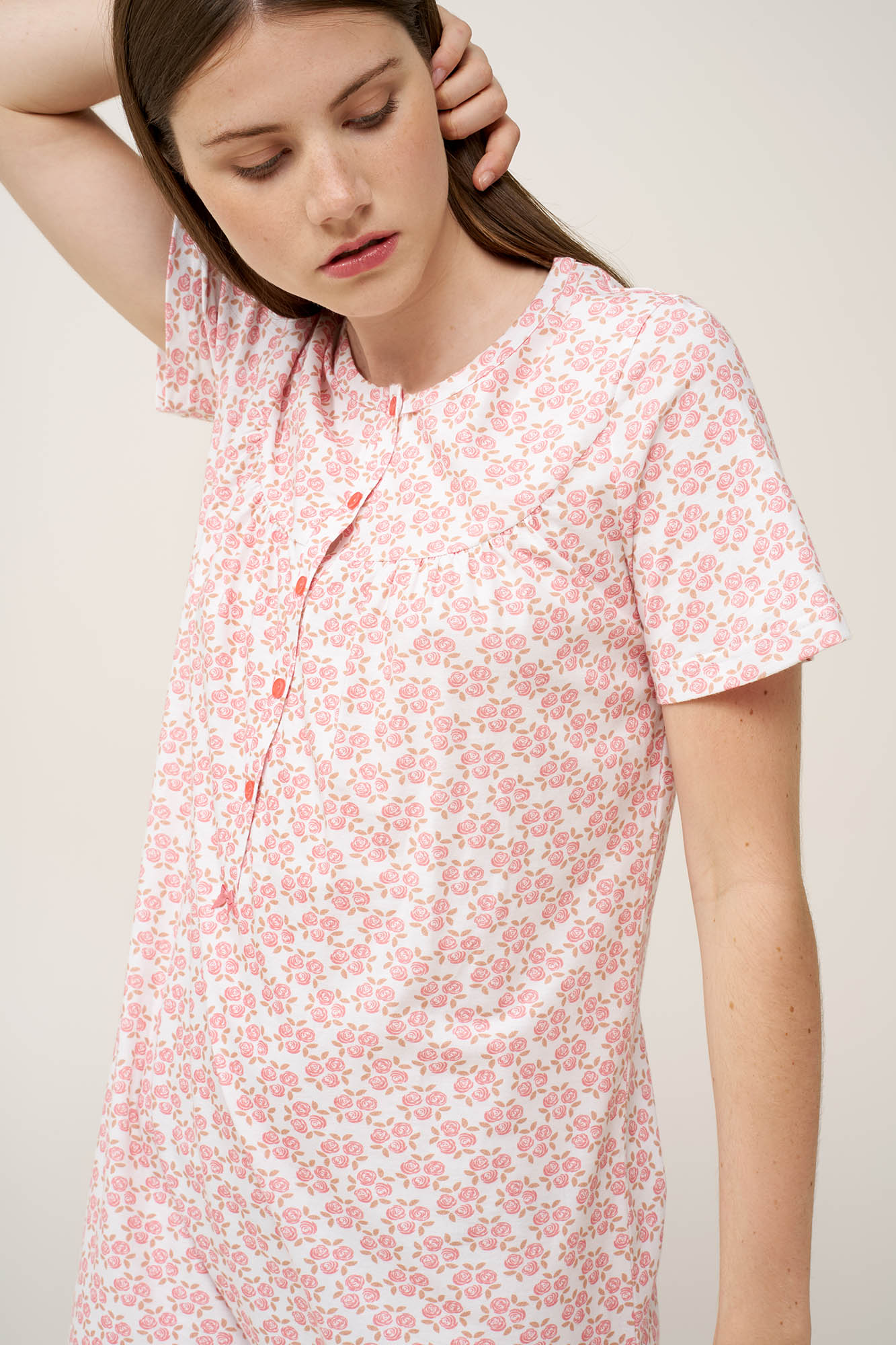 Ανακάλυψε τη διαχρονική κομψότητα που χαρίζει αυτό το καλοκαιρινό νυχτικό, κατασκευασμένο από απαλό και διαπνέον 100% βαμβάκι single jersey. Η πατιλέτα στο στήθος προσθέτει μια κλασική νότα, ενώ οι διακριτικές σούρες στο στήθος ενισχύουν τη θηλυκή του γοητεία Διακοσμημένο με ρομαντικό μοτίβο από τριαντάφυλλα σε ιβουάρ βάση, αποπνέει μια νοσταλγική, διαχρονική γοητεία. Μια εύκολη επιλογή για έναν ξεκούραστο ύπνο ή ένα χαλαρό απόγευμα μετά τη δουλεία