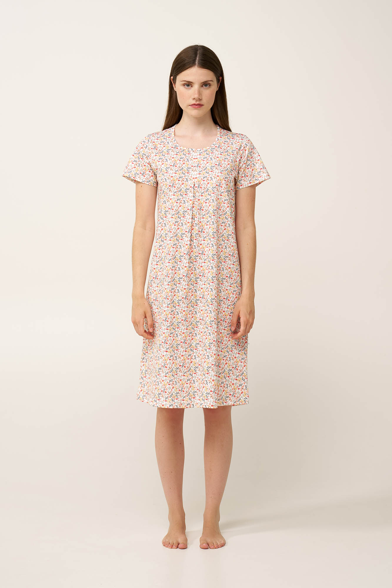 Επιλέξτε ένα νυχτικό, σχεδιασμένο για δροσερές καλοκαιρινές νύχτες. Κατασκευασμένο από απαλό και διαπνέον 100% βαμβάκι single jersey, προσφέρει ανάλαφρη αίσθηση στο δέρμα και άνεση καθ’ όλη τη διάρκεια της νύχτας. Τα κοντά μανίκια και η χαλαρή γραμμή συμπληρώνονται από μια απαλή πιέτα στο μπροστινό μέρος, που χαρίζει επιπλέον άνεση και άνετη εφαρμογή. Διακοσμημένο με παιχνιδιάρικες πεταλούδες και αγριολούλουδα εμπνευσμένα από έναν ανθισμένο ανοιξιάτικο κήπο, προσθέτει μια φωτεινή, χαρούμενη νότα σε ένα διαχρονικό σχέδιο.