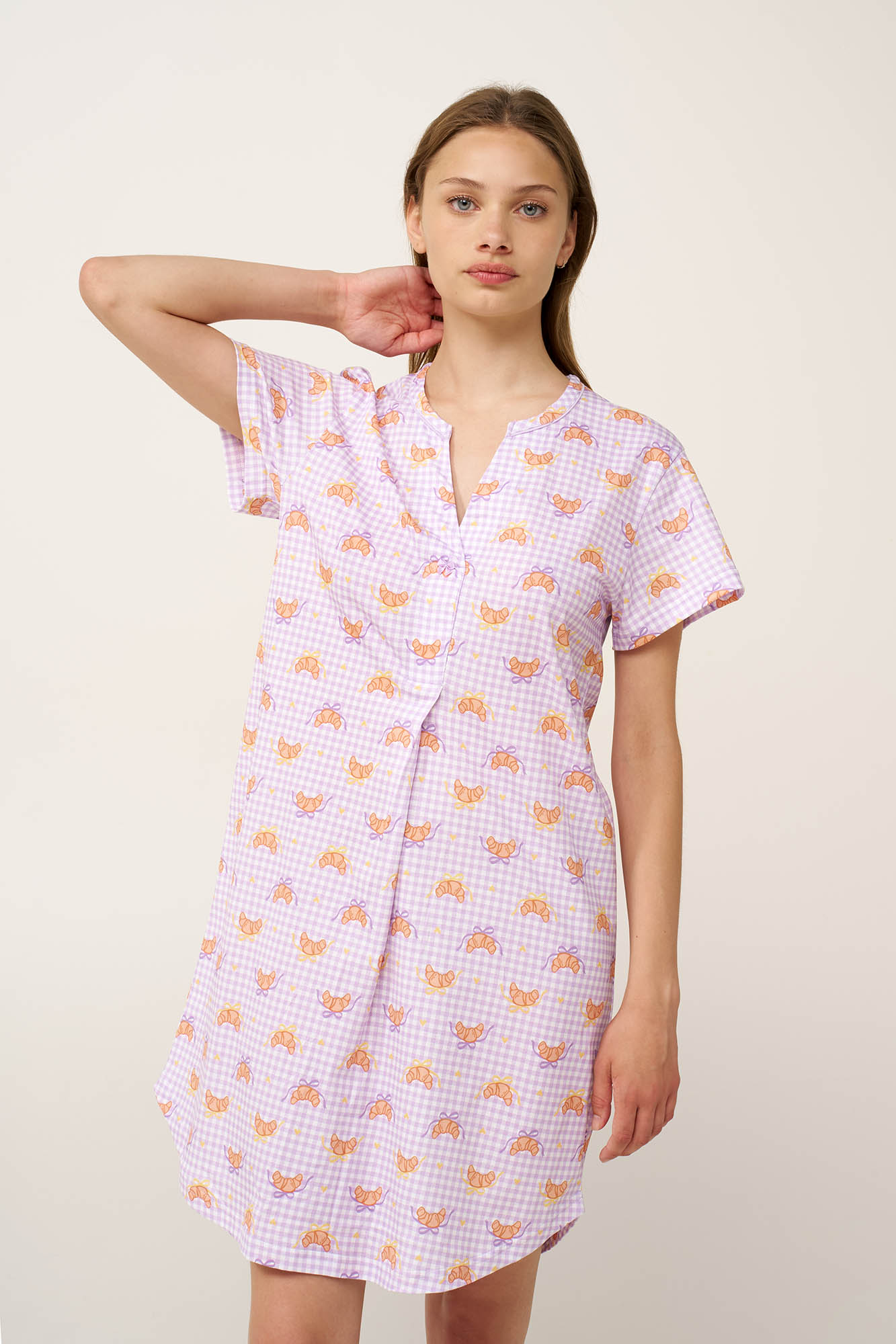Ελαφρύ και άνετο, αυτό το νυχτικό είναι κατασκευασμένο από διαπνέον 100% βαμβάκι single jersey, αποτελώντας ιδανική επιλογή για τις ζεστές καλοκαιρινές νύχτες. Η V λαιμόκοψη προσθέτει μια καθαρή, θηλυκή νότα, ενώ η διακριτική πιέτα μπροστά δημιουργεί επιπλέον χώρο για πιο χαλαρή και άνετη εφαρμογή. Ολοκληρώνεται με χαριτωμένα κρουασάν πάνω σε καρό gingham μοτίβο, που αποπνέει μια γλυκιά, cozy διάθεση. Ιδανικό για να απολαύσετε ένα χαλαρό πρωινό ή το βραδινό σας ύπνο.