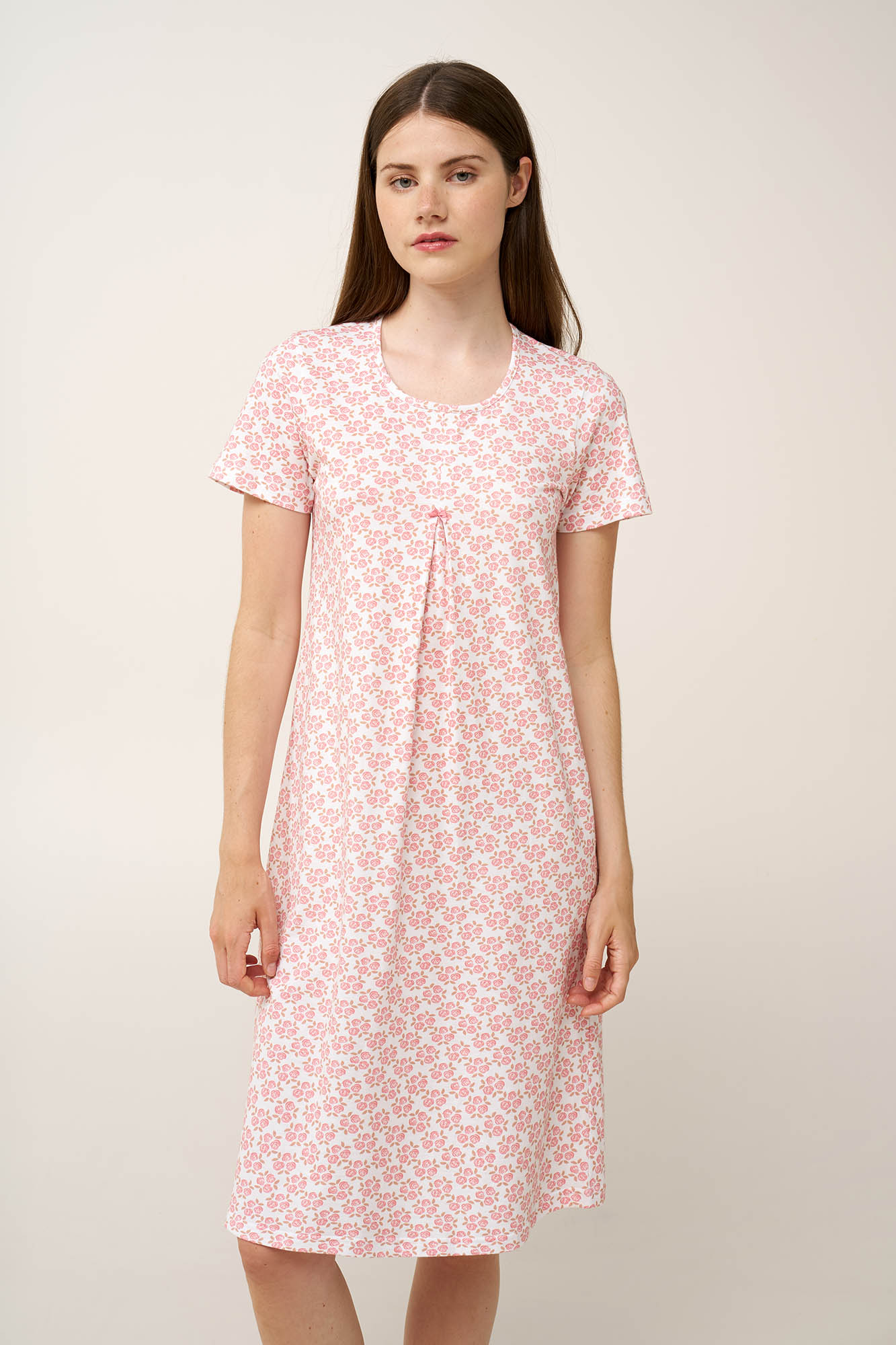 Προσθέστε στη συλλογή σας αυτό το καλοκαιρινό νυχτικό, κατασκευασμένο από απαλό και διαπνέον 100% βαμβάκι single jersey, προσφέροντας ελαφριά και αέρινη αίσθηση. Τα κοντά μανίκια και η διακριτική πιέτα στο μπροστινό μέρος δημιουργούν χαλαρή και άνετη εφαρμογή, ενώ το ρομαντικό μοτίβο από τριαντάφυλλα σε ιβουάρ βάση προσθέτει μια λεπτεπίλεπτη, θηλυκή πινελιά. Απολαύστε κάθε στιγμή του καλοκαιριού με άνεση και γοητεία.