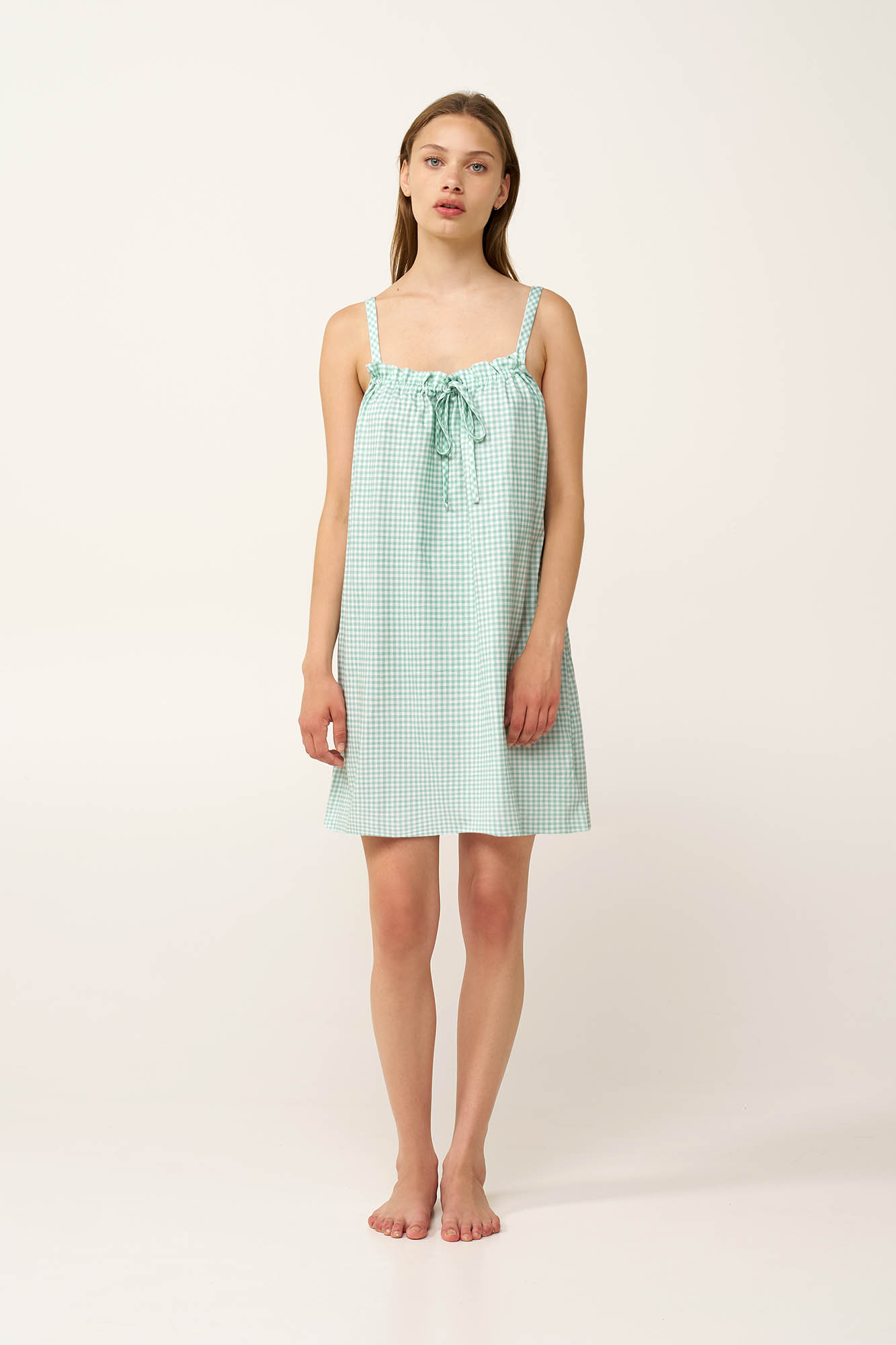 Ανανεώστε τη διάθεση σας με αυτό το καλοκαιρινό νυχτικό, κατασκευασμένο από απαλό και διαπνέον 100% βαμβάκι single jersey που χαρίζει ανάλαφρη αίσθηση στο σώμα. Σχεδιασμένο με λεπτές τιράντες τετράγωνη λαιμόκοψη που δένει μπροστά, προσφέρει άνεση και αναδεικνύει τη θηλυκότητα σας. Ολοκληρωμένο με διαχρονικό καρό gingham μοτίβο που θυμίζει καθαρό ουρανό και θαλασσινή αύρα, χαρίζει φρεσκάδα και δροσιά. Ελαφρύ, αέρινο και κομψό, είναι ιδανικό για χαλάρωση, ύπνο και ήρεμες στιγμές ξεκούρασης.