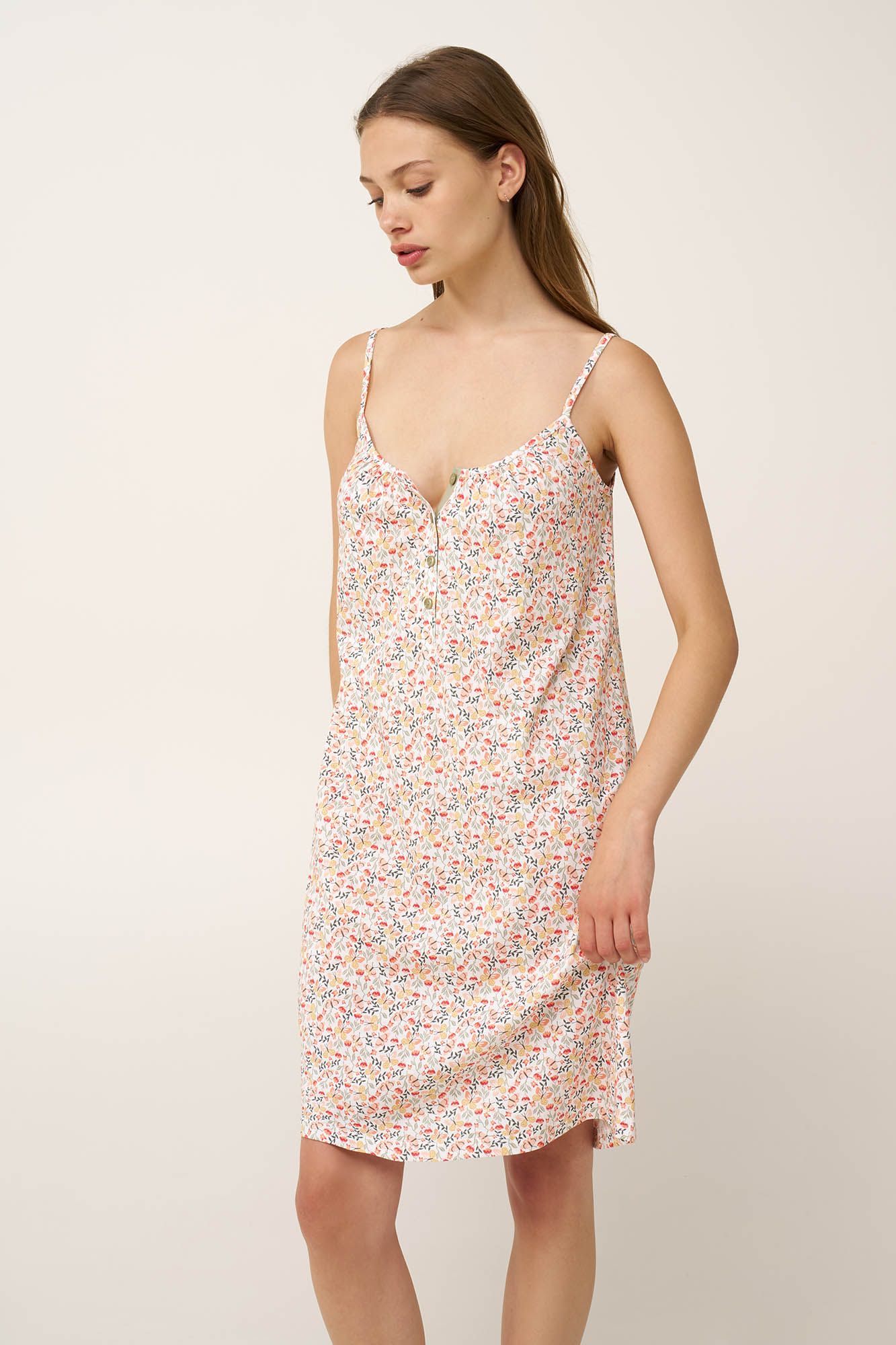 Ελαφρύ και δροσερό, αυτό το νυχτικό είναι σχεδιασμένο για άνεση και χαλάρωση τις πιο ζεστές καλοκαιρινές ημέρες. Κατασκευασμένο από διαπνέον 100% βαμβάκι single jersey, προσφέρει απαλή και ευχάριστη αίσθηση στο δέρμα. Σχεδιασμένο με λεπτές τιράντες και πατιλέτα σε ένα μοτίβο με πεταλούδες και αγριολούλουδα που προσθέτει μια φωτεινή, ανοιξιάτικη διάθεση. Μια εύκολη επιλογή για να απολαύσετε ένα βράδυ στο σπίτι ή ένα ήρεμο πρωινό με θηλυκότητα και άνεση.