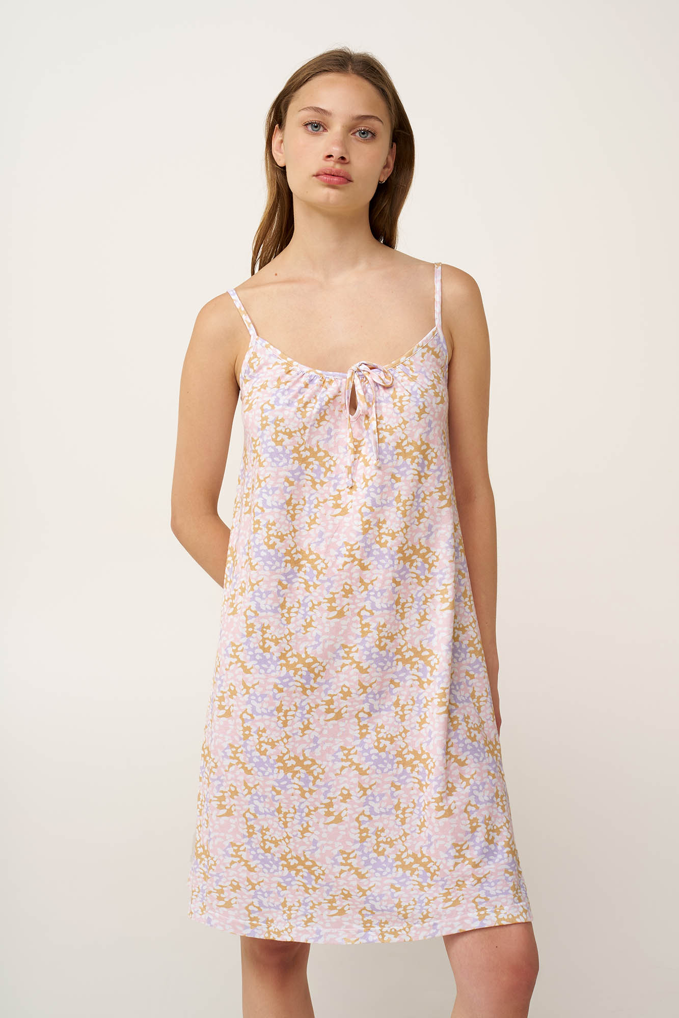 Ανάλαφρο και αβίαστα θηλυκό, αυτό το καλοκαιρινό νυχτικό είναι ιδανικό για ζεστές, χαλαρές νύχτες. Κατασκευασμένο από απαλό και διαπνέον 100% βαμβάκι single jersey, προσφέρει δροσερή αίσθηση στο δέρμα και άνεση όλη τη νύχτα. Οι λεπτές τιράντες και η χαλαρή εφαρμογή δημιουργούν μια κομψή σιλουέτα, ενώ το δέσιμο στο λαιμό προσθέτει μια διακριτική, ρομαντική λεπτομέρεια. Ιδανικό για χαλάρωση, ξεκούραση και στιγμές απόλυτης άνεσης.