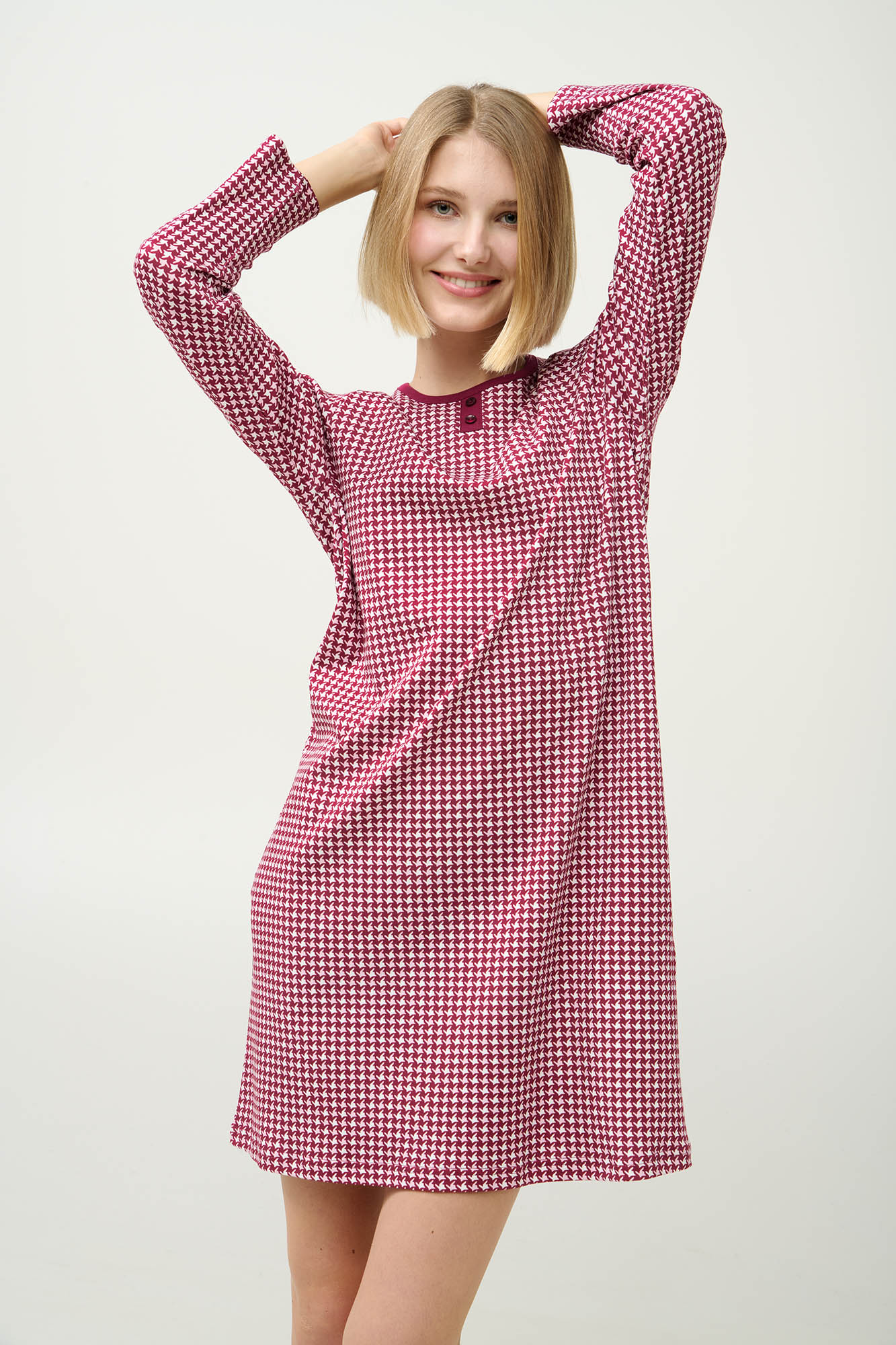 Απολαύστε κάθε στιγμή στο σπίτι με ένα νυχτικό από 100% βαμβάκι interlock εξαιρετικής ποιότητας. Σχεδιασμένο με μακριά μανίκια και διαχρονικό μοτίβο pied de poule, συνδυάζει ιδανικά διακριτική κομψότητα και τη ζεστή αίσθηση του υφάσματος που επιτρέπει στο σώμα να αναπνέει χαρίζοντας άνεση όλη τη νύχτα. Ιδανικό για στιγμές χαλάρωσης στο σπίτι ή για να προσθέσετε μια εκλεπτυσμένη νότα στην καθημερινότητα σας.