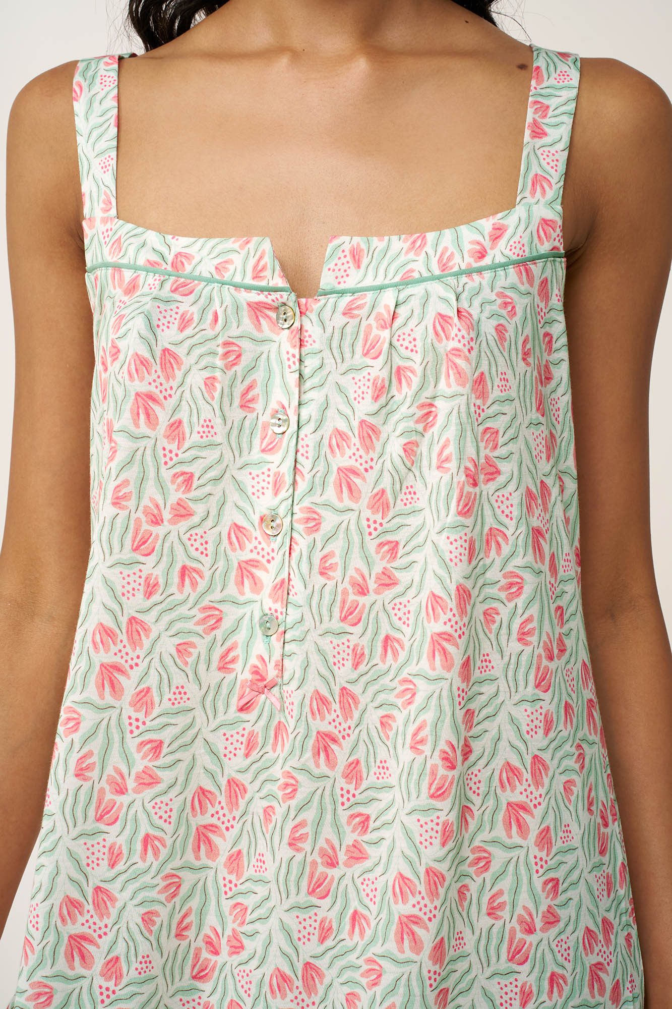 Ανανεώστε τη συλλογή σας με αυτό το αμάνικο νυχτικό από cotton-modal, σχεδιασμένο για ανάλαφρη και δροσερή άνεση. Το διαπνέον ύφασμα είναι απαλό στο δέρμα και ιδανικό για τις ζεστές νύχτες, ενώ η κλασική του πατιλέτα προσθέτει μια διακριτική, διαχρονική κομψότητα. Διακοσμημένο με φλοράλ μοτίβο εμπνευσμένο από ηλιόλουστους ανοιξιάτικους κήπους, αποπνέει γλυκύτητα και φυσική γοητεία, ιδανική για τα χαλαρά πρωινά των διακοπών σας ή έναν ήρεμο απογευματινό ύπνο.