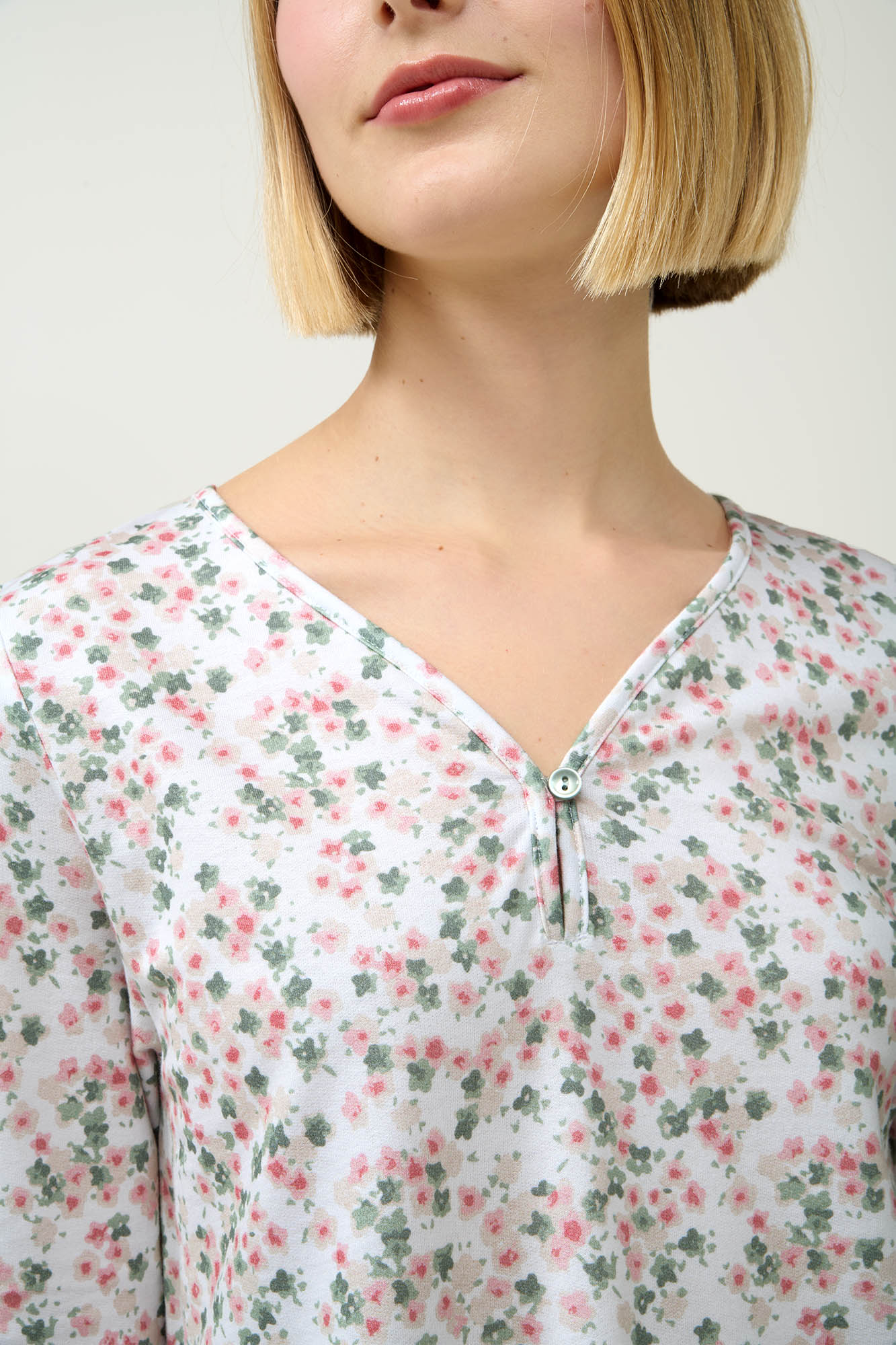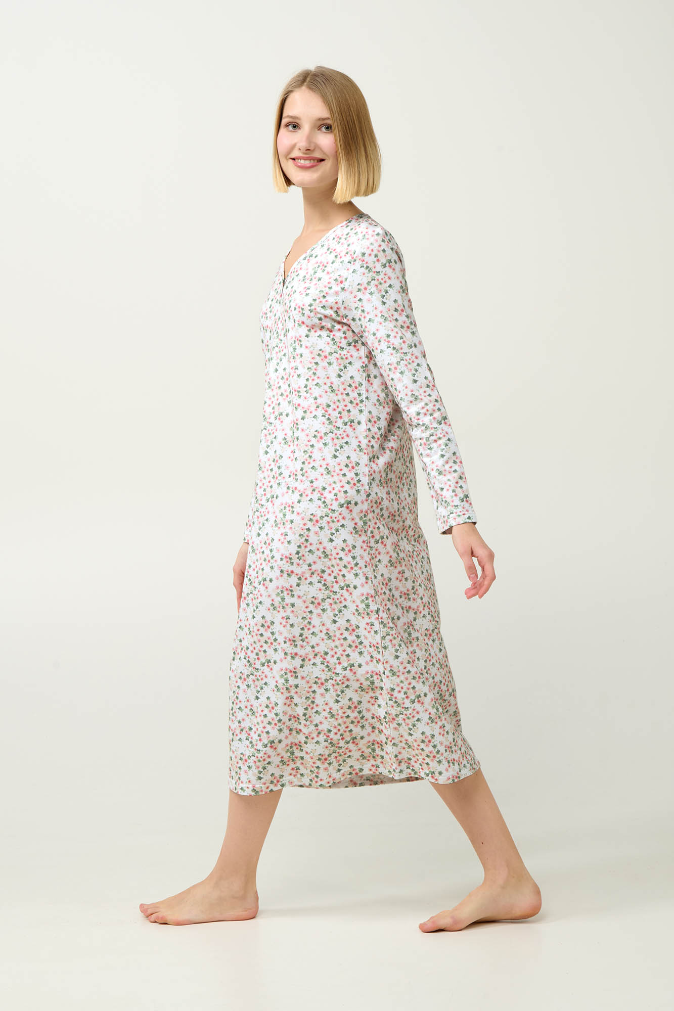 Προσθέστε στη συλλογή σας ένα χειμερινό νυχτικό, κατασκευασμένο από 100% βαμβάκι φούτερ. Διαθέτει ρομαντικό φλοράλ μοτίβο και μακριά μανίκια, προσφέροντας διαχρονική κομψότητα, ενώ το διαπνέον ύφασμα χαρίζει φυσικά ζεστή αίσθηση και διαρκή απαλότητα. Σχεδιασμένο για χαλαρές βραδιές, αυτό το κλασικό νυχτικό συνδυάζει άνεση και στυλ.