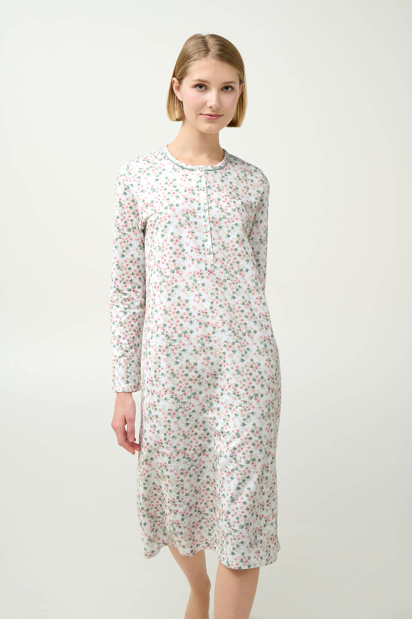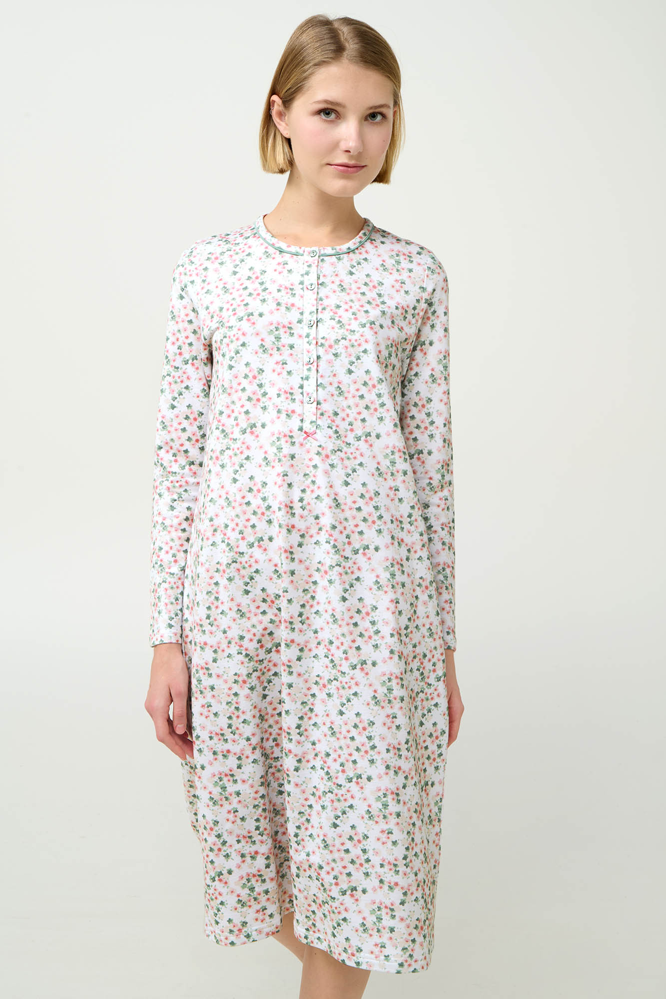 Ανακαλύψτε την απόλυτη άνεση με αυτό το χειμερινό νυχτικό, κατασκευασμένο από 100% βαμβακερό φούτερ με απαλή υφή και ζεστή αίσθηση στο σώμα. Είναι σχεδιασμένο με πατιλέτα και μακριά μανίκια σε ρομαντικό φλοράλ μοτίβο που ενισχύει τον κλασικό του χαρακτήρα. Ιδανικό για στιγμές χαλάρωσης και ξεκούραστου ύπνου τις κρύες ημέρες του χειμώνα.