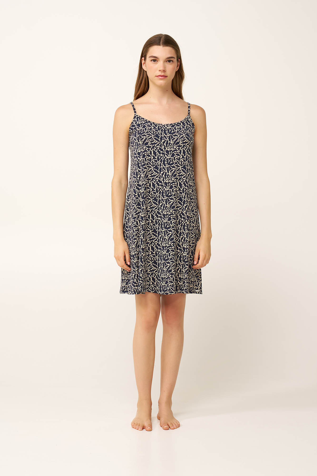 Προσθέστε στην γκαρνταρόμπα σας ένα καλοκαιρινό νυχτικό, κατασκευασμένο από μεταξένια απαλό και διαπνέον LENZING Tencel Modal Micro με elastane. Σχεδιασμένο με λεπτές τιράντες σε ανάλαφρη, χαλαρή εφαρμογή και ένα εντυπωσιακό φλοράλ μοτίβο σε βαθύ μπλε καμβά που προσθέτει γοητεία και φρεσκάδα. Μια δροσερή επιλογή που θα αναδείξει τη θηλυκότητα σας και θα σας βοηθήσει να απολαύσετε τις πιο ζεστές ημέρες του καλοκαιριού.