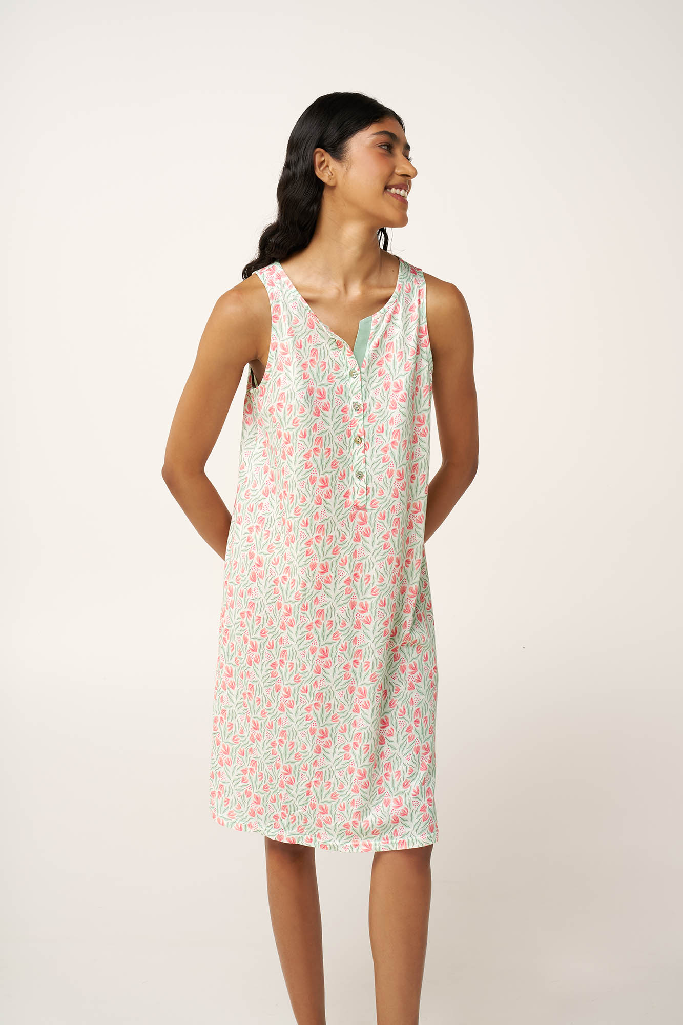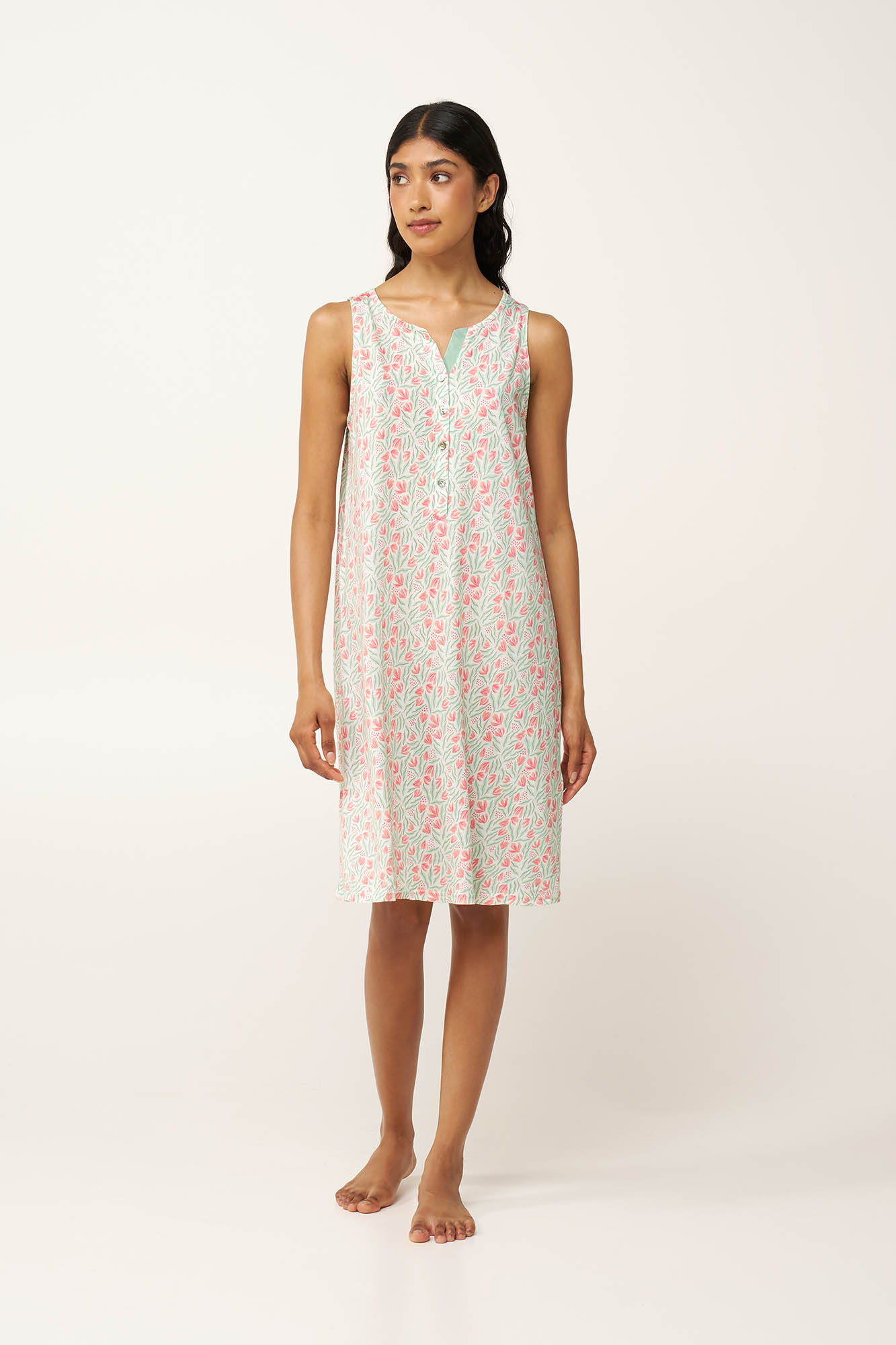 Απαλό, άνετο και ιδανικό για ζεστά καλοκαιρινά βράδια, αυτό το νυχτικό από cotton-modal χαρίζει φρεσκάδα και φυσική κομψότητα στο nightwear σας. Το διαπνέον ύφασμα είναι δροσερό στο δέρμα και προσφέρει άνεση που διαρκεί όλη τη νύχτα. Σχεδιασμένο με πρακτική πατιλέτα που μπορεί να εξυπηρετήσει τον θηλασμό, ενώ η χαλαρή γραμμή εξασφαλίζει άνετη εφαρμογή σε όλο το σώμα. Με μανίκια που καλύπτουν απαλά τους ώμους και διακριτικό φλοράλ μοτίβο εμπνευσμένο από ανθισμένους κήπους, συνδυάζει ιδανικά καθημερινή και θηλυκή γοητεία.