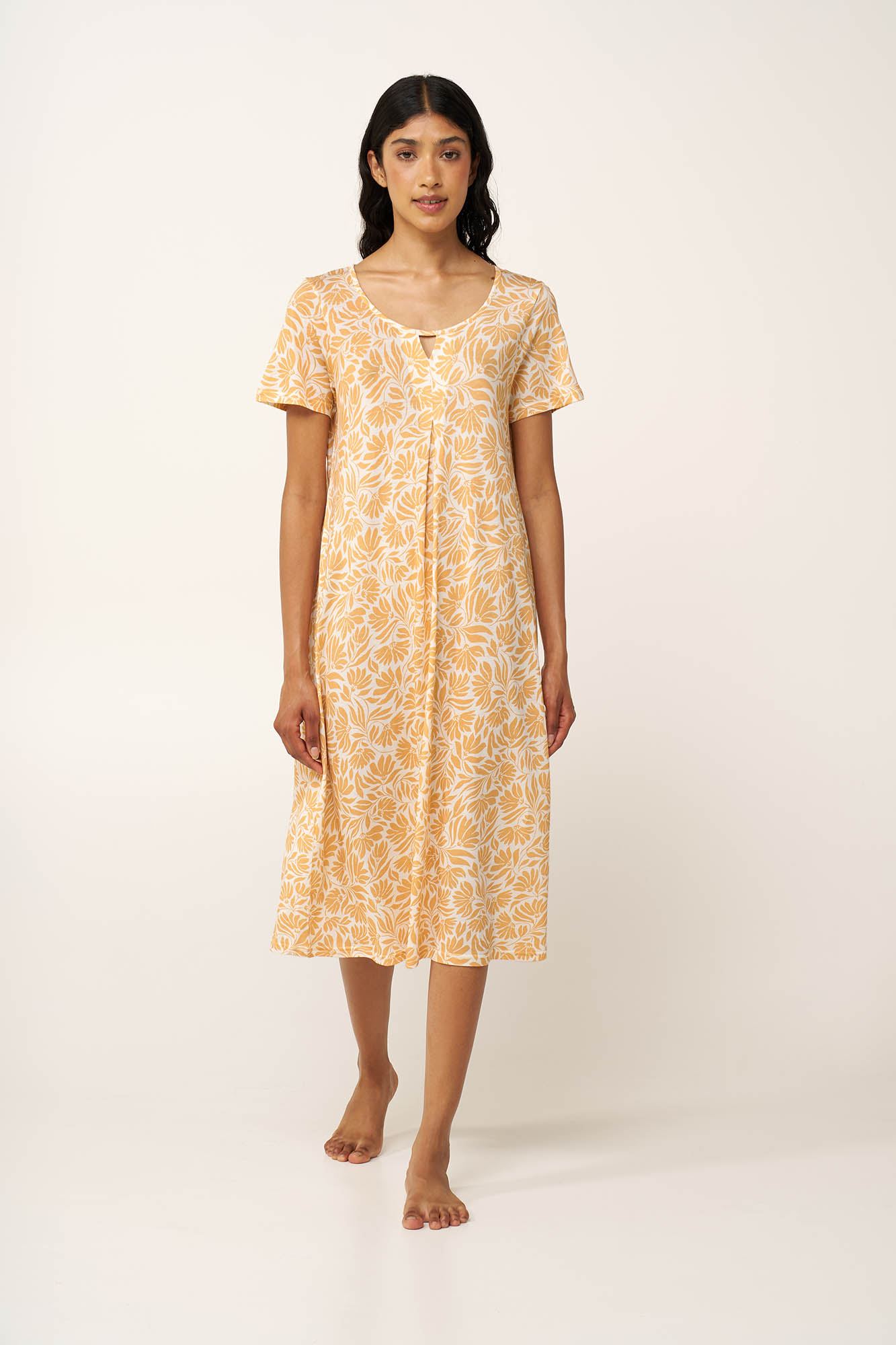 Αφεθείτε στην άνεση που μπορεί να σας χαρίσει ένα απαλό κοντομάνικο νυχτικό από βαμβάκι και modal, τις ζεστές καλοκαιρινές νύχτες. Εμπνευσμένο από ηλιόλουστους κήπους, το απαλό κίτρινο φλοράλ μοτίβο αποτυπώνει τη ζεστασιά του δειλινού. Η πιέτα στο μπροστινό μέρος χαρίζει άνεση και φυσική κίνηση, δημιουργώντας μια χαλαρή εφαρμογή που αγκαλιάζει απαλά το σώμα. Ανάλαφρο και δροσερό, είναι ιδανικό τόσο για τον ύπνο όσο και για στιγμές χαλάρωσης στο σπίτι.