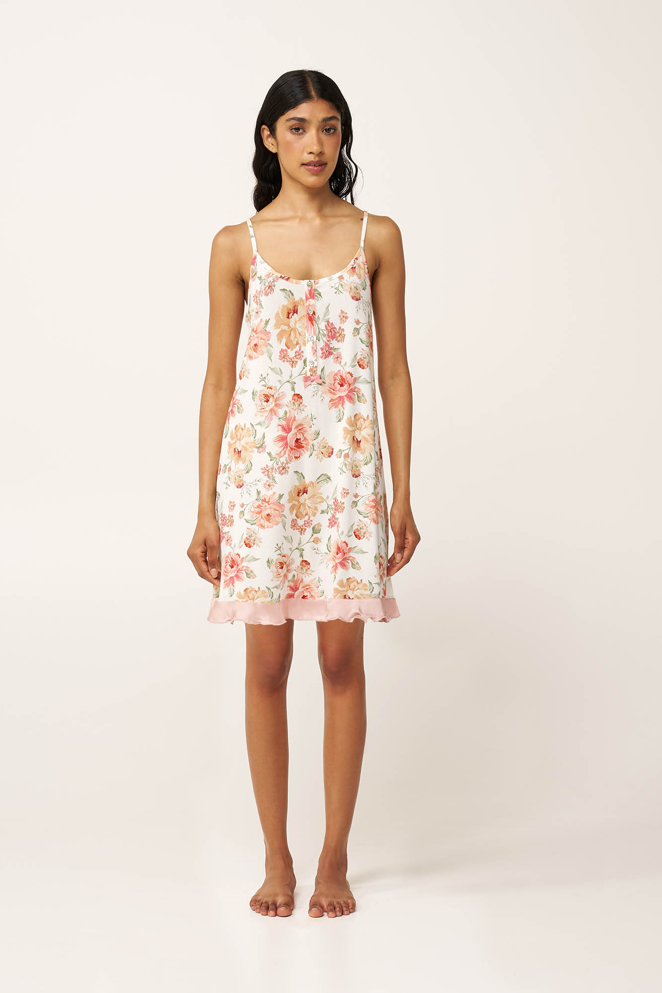 Κατασκευασμένο από ανάλαφρο LENZING Tencel Modal Micro, αυτό το καλοκαιρινό νυχτικό συνδυάζει άνεση και κομψότητα σε ένα δροσερό, διαπνέον σχέδιο. Το vintage φλοράλ μοτίβο και οι λεπτές τιράντες χαρίζουν θηλυκότητα, ενώ η πατιλέτα μπροστά άνεση και διαχρονική γοητεία. Διακοσμημένο με ρομαντικές λεπτομέρειες από σιφόν στο τελείωμα, είναι ιδανικό για ζεστές νύχτες, στιγμές χαλάρωσης στο σπίτι ή ξεκούραστο ύπνο.
