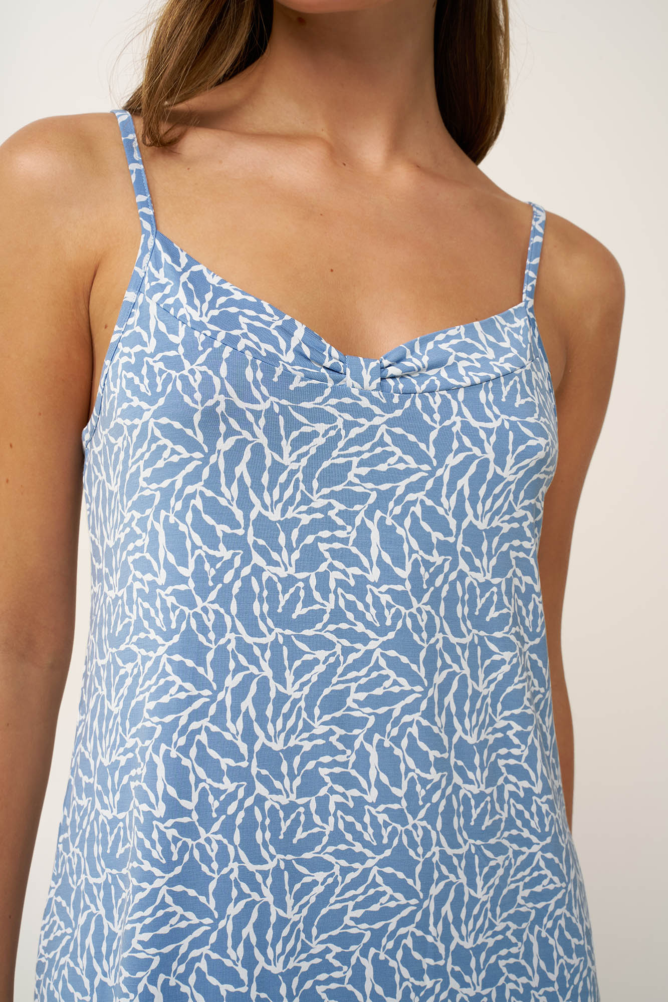 Αφεθείτε στις καλοκαιρινές νύχτες με αυτό το κομψό νυχτικό με λεπτές τιράντες, φτιαγμένο από LENZING Tencel Modal Micro με elastane. Το απαλό και δροσερό ύφασμα αγκαλιάζει ευχάριστα το σώμα, χαρίζοντας αίσθηση ελευθερίας και θηλυκότητα ενώ το φλοράλ μοτίβο προσθέτει φρεσκάδα και αέρινη κομψότητα. Ιδανικό για στιγμές χαλάρωσης στο σπίτι ή για έναν ήρεμο, ξεκούραστο ύπνο.