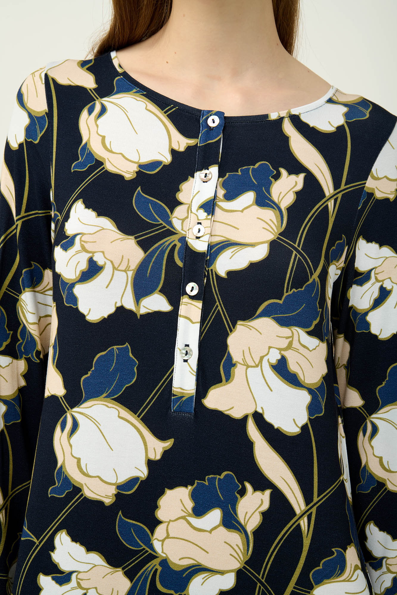 Επιλέξτε ένα νυχτικό που συνδυάζει διαχρονική κομψότητα και καθημερινή άνεση. Κατασκευασμένο από μαλακή, ελαστική viscose με ρομαντικό φλοράλ μοτίβο με λευκές τουλίπες και κλασική πατιλέτα. Η χαλαρή γραμμή του προσφέρει ελευθερία κινήσεων και άνεση κάνοντας το μια ιδανική πρόταση για μια ξεκούραστη νύχτα ή τις στιγμές χαλάρωσης σας στο σπίτι.