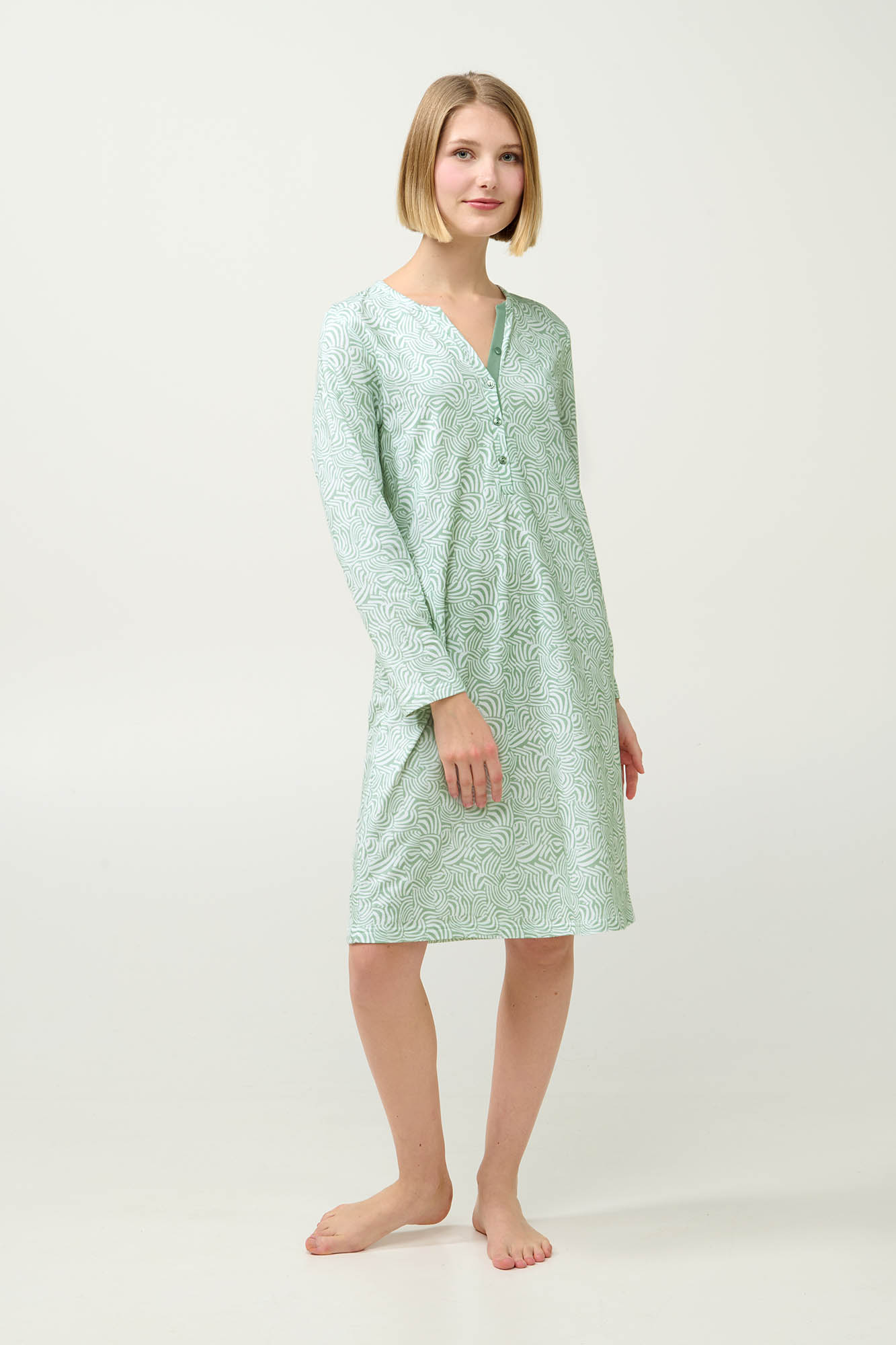 Απολαύστε τα βράδια του χειμώνα φορώντας αυτό το κλασικό νυχτικό, φτιαγμένο από 100% βαμβάκι φούτερ που προσφέρει φυσική ζεστασιά και απαλή αίσθηση. Σχεδιασμένο με πατιλέτα σε απαλό πράσινο μοτίβο εμπνευσμένο από ζέβρα, συνδυάζει άνετη εφαρμογή και διαχρονική γοητεία. Μια εύκολη επιλογή για τις στιγμές χαλάρωσης σας τις κρύες ημέρες του χειμώνα.