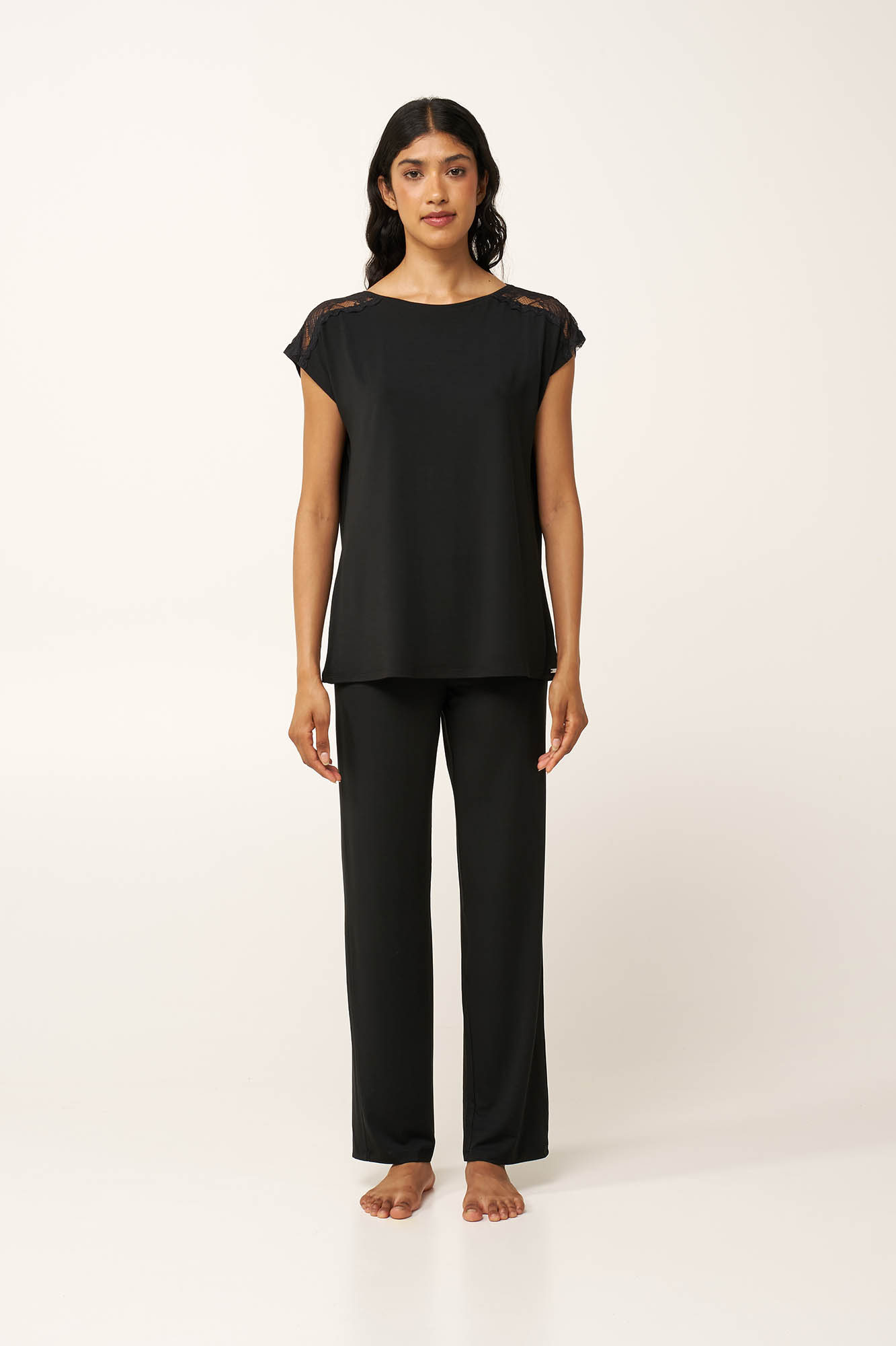 Προσθέστε στην γκαρνταρόμπα σας ένα καλοκαιρινό σετ γυναικείες πυτζάμες, κατασκευασμένο από εξαιρετικά απαλό και διαπνέον LENZING Tencel Modal Micro που αγκαλιάζει ευχάριστα το σώμα. Σχεδιασμένο σε χαλαρή, αέρινη γραμμή με μακρύ παντελόνι και τοπ διακοσμημένο με κομψή δαντέλα στους ώμους που ενισχύει τον διαχρονικό του χαρακτήρα. Ελαφρύ και δροσερό είναι μια επιλογή που θα απολαύσετε για χρόνια.
