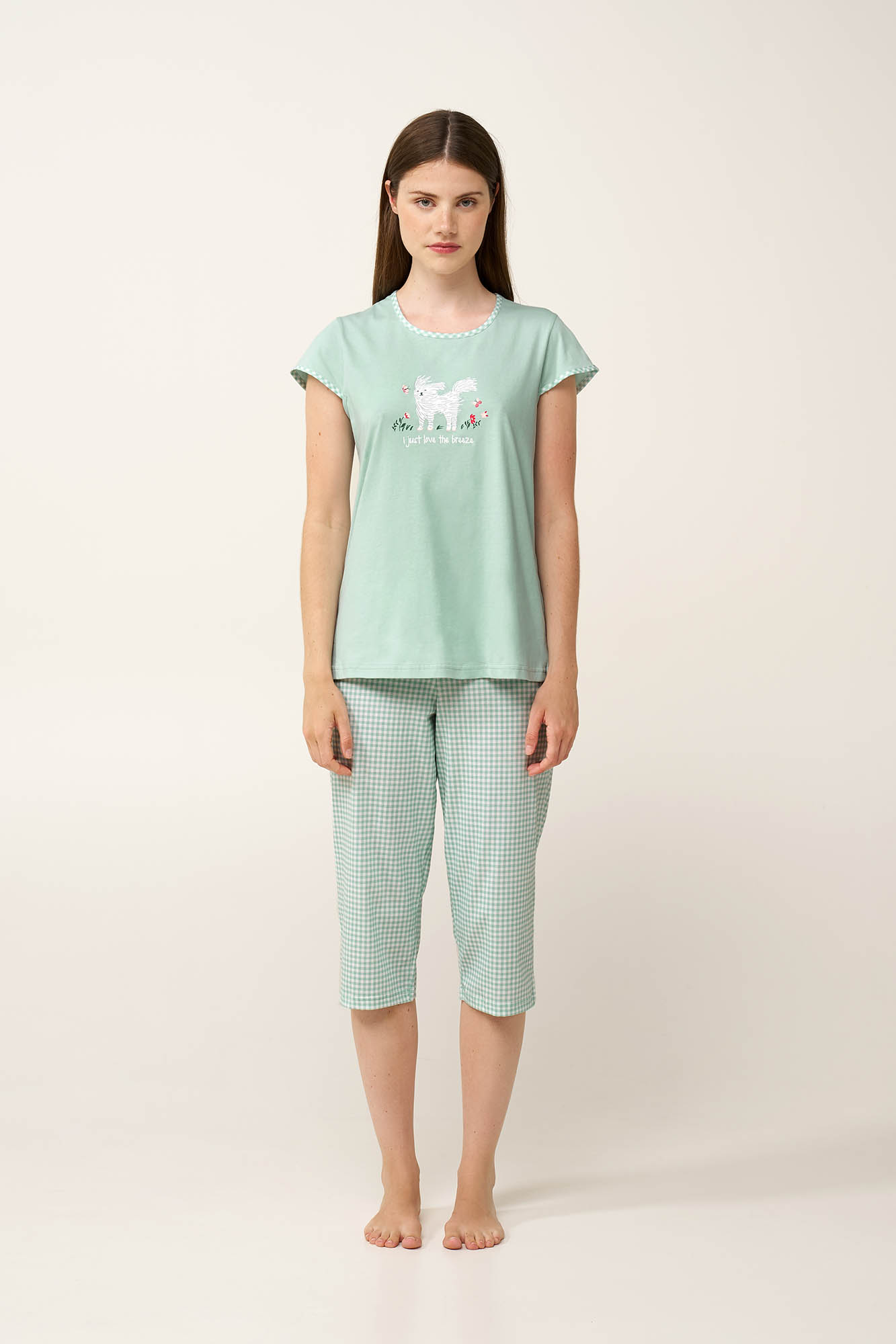 Επιλέξτε αυτό το γυναικείο σετ πυτζάμες, κατασκευασμένο από απαλό και διαπνέον 100% βαμβάκι single jersey που προσφέρει ελαφριά και ευχάριστη αίσθηση στο δέρμα. Αποτελείται από κοντομάνικο τοπ, με ένα γλυκό τύπωμα στο στήθος, προσθέτοντας μια παιχνιδιάρικη και χαριτωμένη πινελιά. Το σετ συμπληρώνει ένα κάπρι παντελόνι με διαχρονικό καρό gingham σχέδιο που θυμίζει καθαρό ουρανό και θαλασσινή αύρα. Σχεδιασμένο για όμορφες στιγμές στο σπίτι, συνδυάζει καθημερινή άνεση και ανάλαφρο χαρακτήρα.