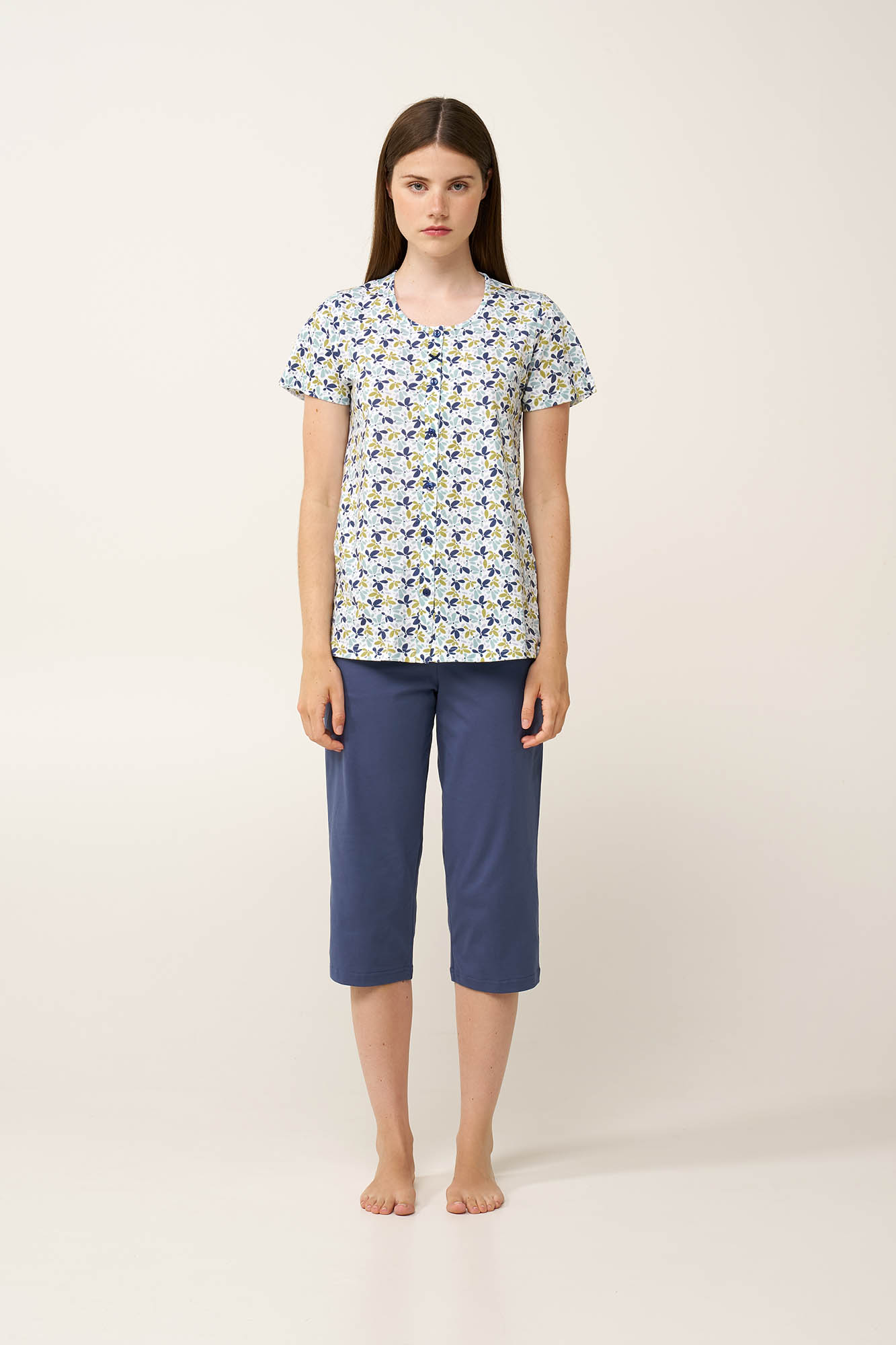 Ανανεώστε τη διάθεση σας με ένα σετ γυναικείες πυτζάμες από απαλό και διαπνέον 100% βαμβάκι single jersey, που θα σας χαρίσει άνεση τις ζεστές καλοκαιρινές ημέρες. Αποτελείται από κουμπωτό τοπ με ένα μοτίβο φύλων σε απαλές γήινες αποχρώσεις και συνοδεύεται από ένα μονόχρωμο κάπρι παντελόνι που ισορροπεί το σύνολο. Ιδανικό για να το βραδινό σας ύπνο ή για να απολαύσετε ένα απόγευμα μετά από μια μεγάλη ημέρα.