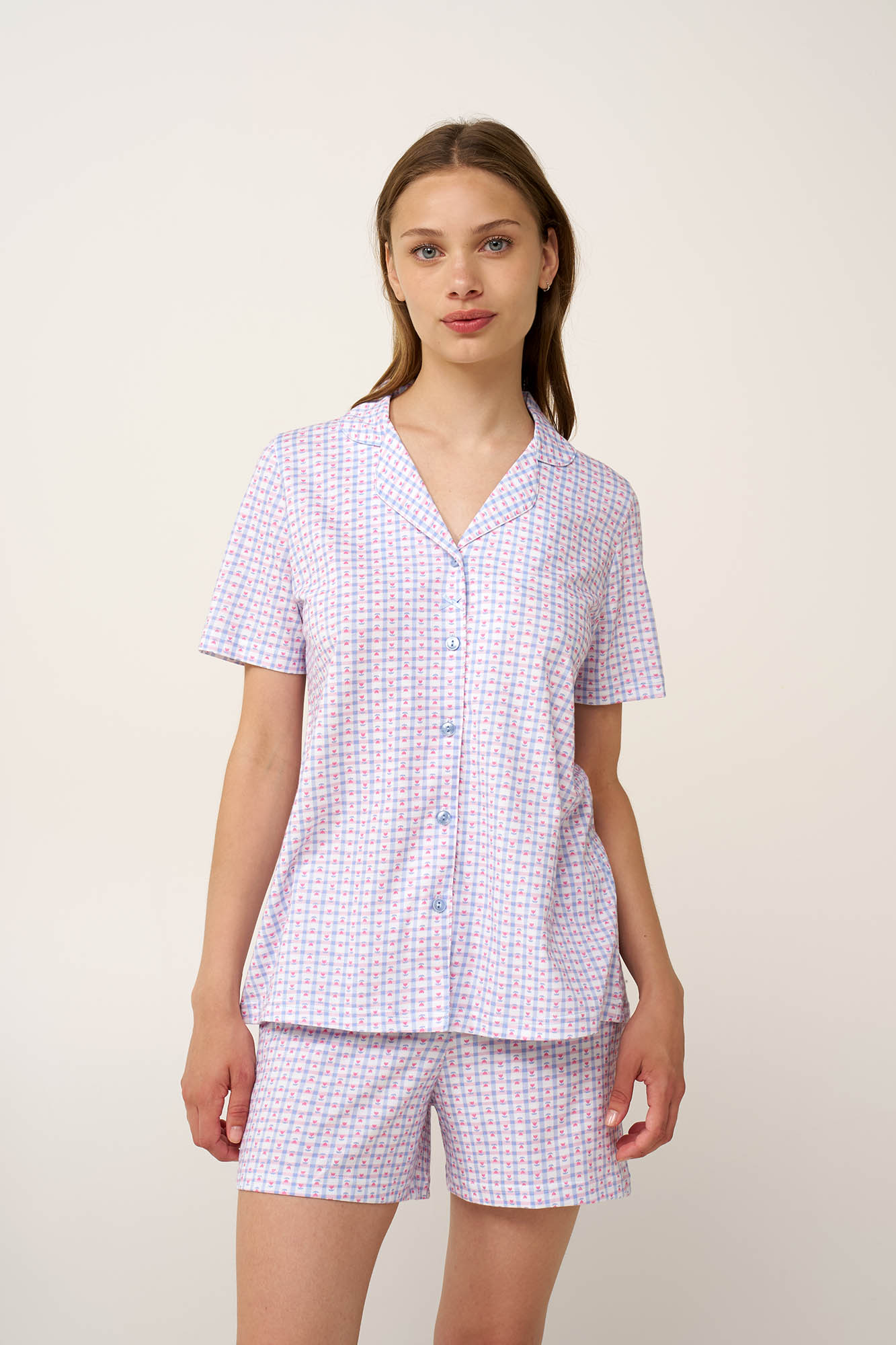 Αυτές οι γυναικείες πυτζάμες είναι σχεδιασμένες για ήσυχα καλοκαιρινά βράδια και στιγμές ξεκούρασης στο σπίτι. Κατασκευασμένες από απαλό και διαπνέον 100% βαμβάκι single jersey, προσφέρουν ευχάριστη αίσθηση στο δέρμα και δροσερή εφαρμογή. Το παιχνιδιάρικο καρό με τουλίπες σε ροζ και μπλε αποχρώσεις χαρίζει μια χαρούμενη, φωτεινή νότα, δίνοντας χαρακτήρα στο κλασικό σχέδιο. Το κουμπωτό τοπ συνδυάζεται με ένα κοντό παντελόνι δημιουργώντας ένα σετ ιδανικό για χ καθημερινή άνεση με μια ευχάριστη, feel-good διάθεση.